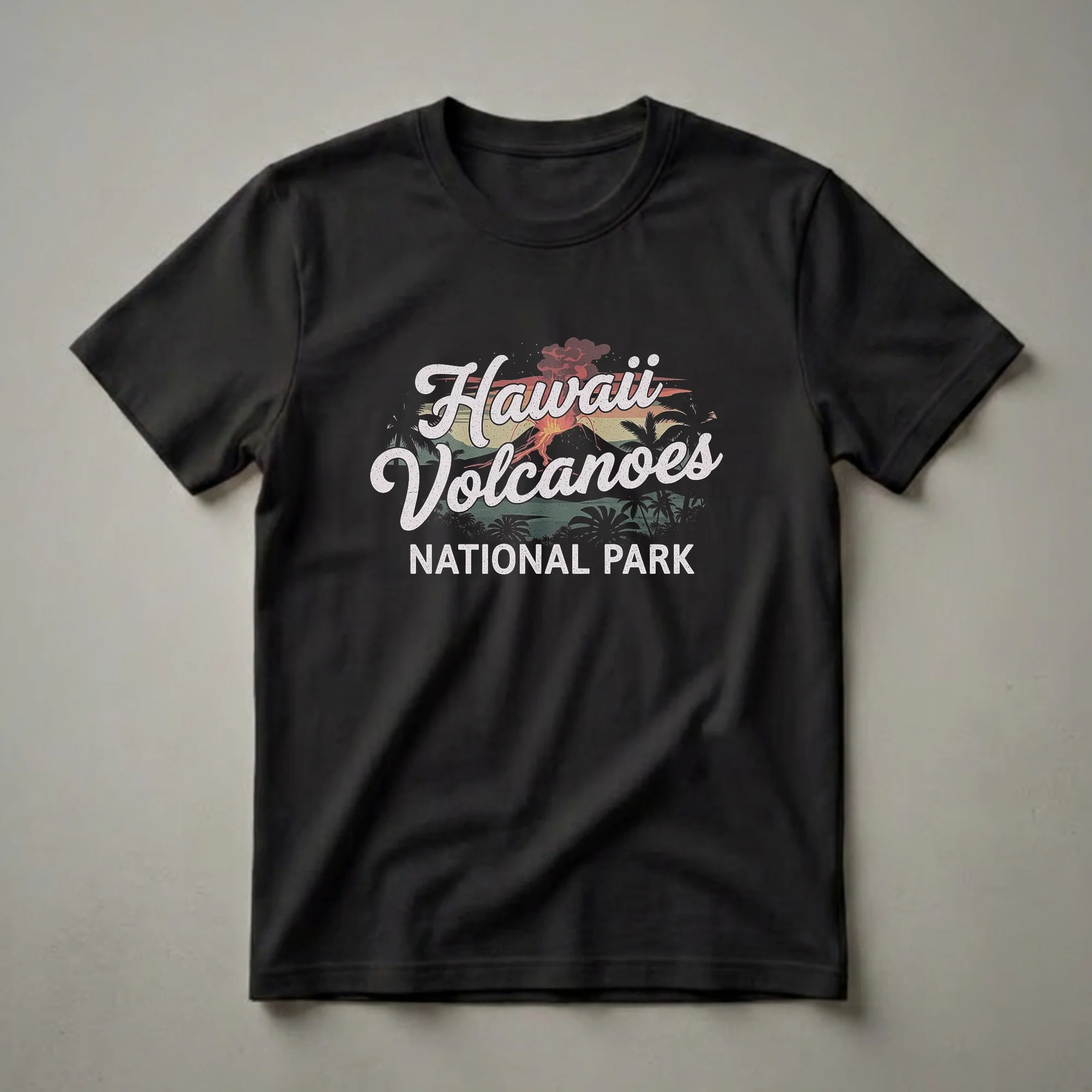 Hawaii Volcanoes National Park, located on the Big Island of Hawaii, is home to Kīlauea, one of the world's most active volcanoes. This striking graphic tee captures the raw power and beauty of an eruption, set against a backdrop of lush palm trees and a vibrant sunset. The retro design evokes a sense of adventure and nostalgia for this unique natural wonder. This shirt is a thoughtful gift for any hiker, camper, or outdoor enthusiast who has explored the dramatic landscapes of Hawaii Volcanoes National Park. Wear it on your next adventure or as a reminder of your unforgettable trip to the islands. It's a staple in the collection for anyone who appreciates the dynamic geology and tropical beauty of this iconic park. This t-shirt works well for casual outings or exploring the park's trails, letting you carry a piece of Hawaii with you.
