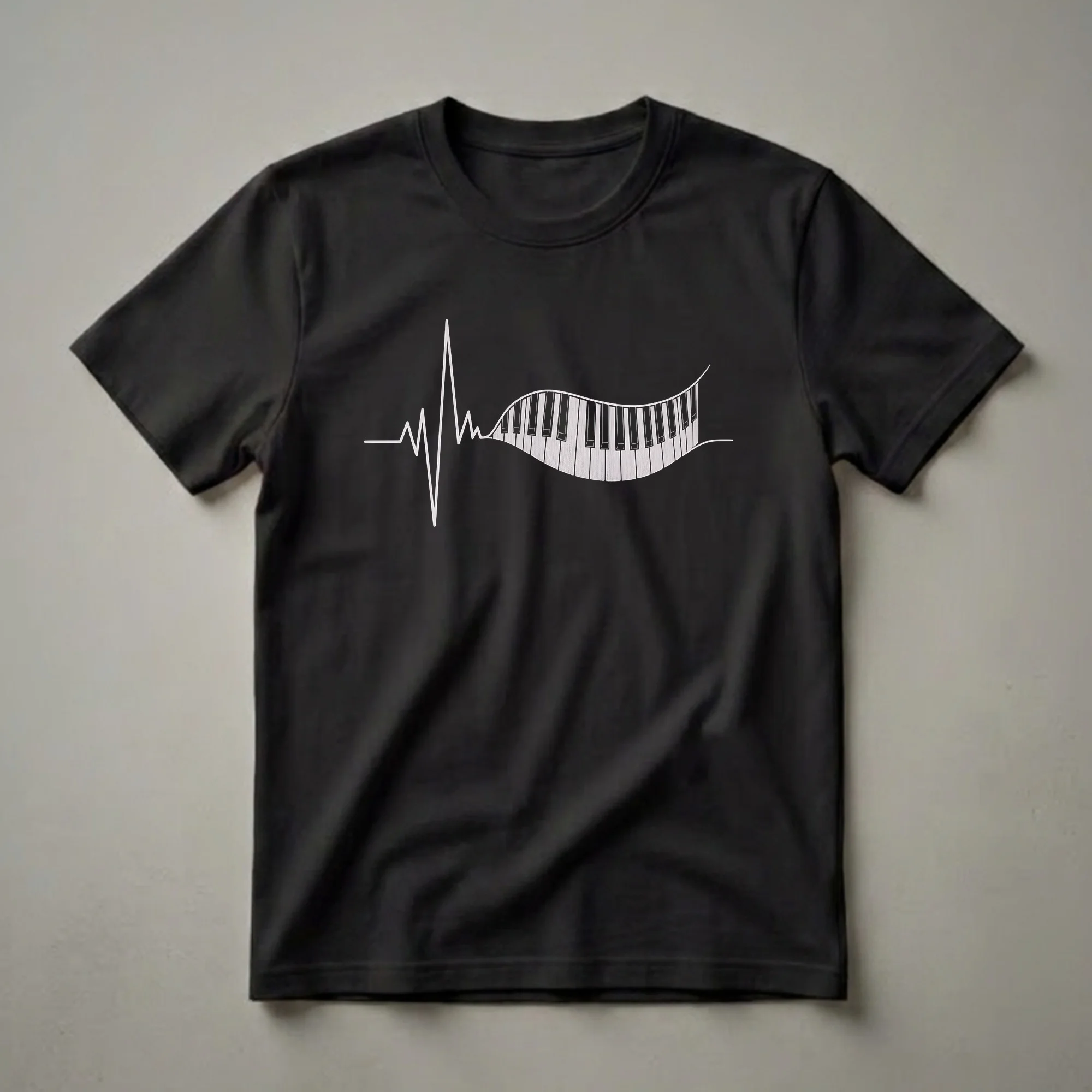 Pianists and music lovers will reach for this striking graphic tee that artfully combines the rhythm of a heartbeat with the iconic imagery of a piano keyboard. The design features a clean, white line art representation of an EKG heartbeat seamlessly transitioning into a curved piano keyboard. This visual metaphor speaks to the deep passion and lifeblood that music brings to those who play or deeply appreciate it. Pianos, a cornerstone of Western music, have a rich history dating back to the early 18th century and continue to be a versatile instrument for composers and performers alike. This shirt is a thoughtful gift for the piano player in your life, the music student, or anyone who finds their pulse quickens with every note. Wear it to your next practice session, a casual concert, or simply when you want to express your musical soul.