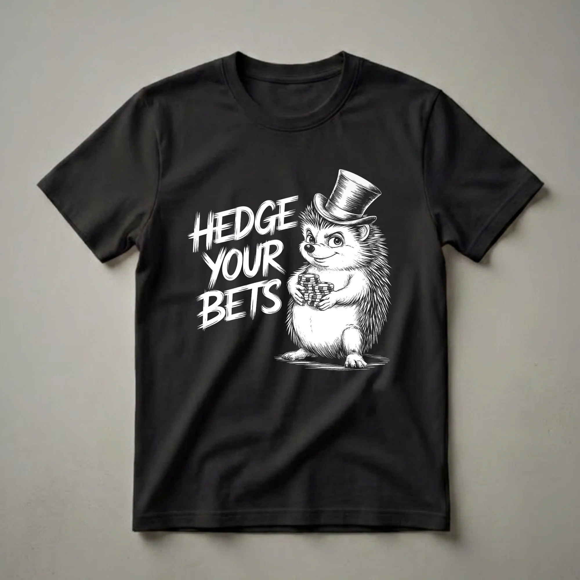 Poker players who appreciate a good pun will reach for this unique hedgehog tee. The design features a charming hedgehog, impeccably dressed in a top hat, clutching stacks of poker chips. The bold, distressed text "HEDGE YOUR BETS" adds a playful and witty touch, perfectly capturing the spirit of the game. Hedgehogs, known for their solitary nature and defensive quills, are humorously reimagined here as savvy gamblers, ready to take on the card table. This graphic shirt is a thoughtful gift for any poker enthusiast, whether they prefer Texas Hold'em, Omaha, or a friendly home game. It's an eye-catching conversation starter, great to wear to game nights, poker tournaments, or casual outings with friends. This t-shirt is a staple for anyone who enjoys a bit of luck and a lot of strategy at the felt. Celebrate your passion for cards with this distinctive piece of apparel, a true conversation starter.