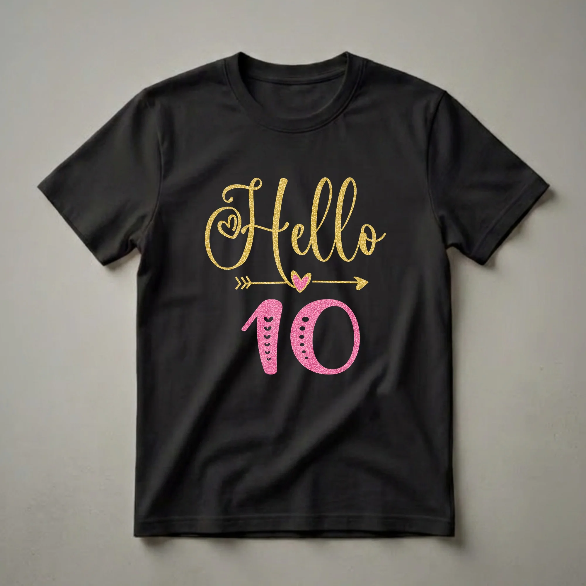 Turning ten marks a significant milestone, transitioning from childhood into the pre-teen years. This eye-catching graphic tee celebrates that exciting moment with a vibrant design. The word "Hello" is rendered in a shimmering gold glitter font, complete with a small heart accent within the "o" and a decorative swirl. Below it, an arrow graphic with a small pink heart in the center points towards the number "10." The number ten itself is presented in a dazzling pink glitter texture, adorned with small heart shapes on the left side of the '1' and scattered dots on the '0.' This t-shirt is a fantastic way for any girl to announce her big 1-0. It's a staple in any birthday girl's wardrobe, great to wear to a birthday party, school, or any casual outing during her tenth year. This shirt makes a thoughtful gift for any girl celebrating her 10th birthday, offering a fun and stylish way to commemorate the occasion. Imagine her excitement opening this as a present, ready to show off her new age with pride.