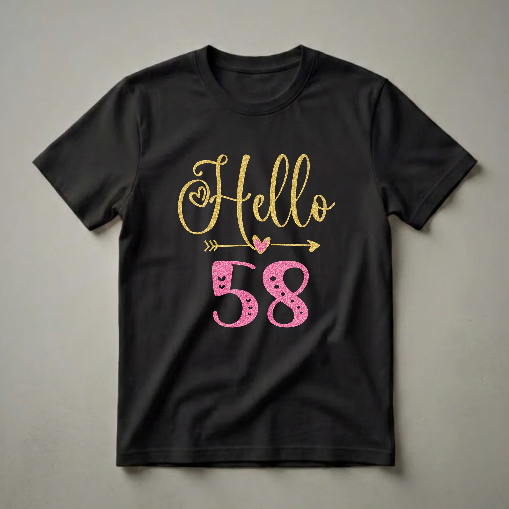 - "Hello 58" glitter graphic tee for women celebrating their special 58th birthday.