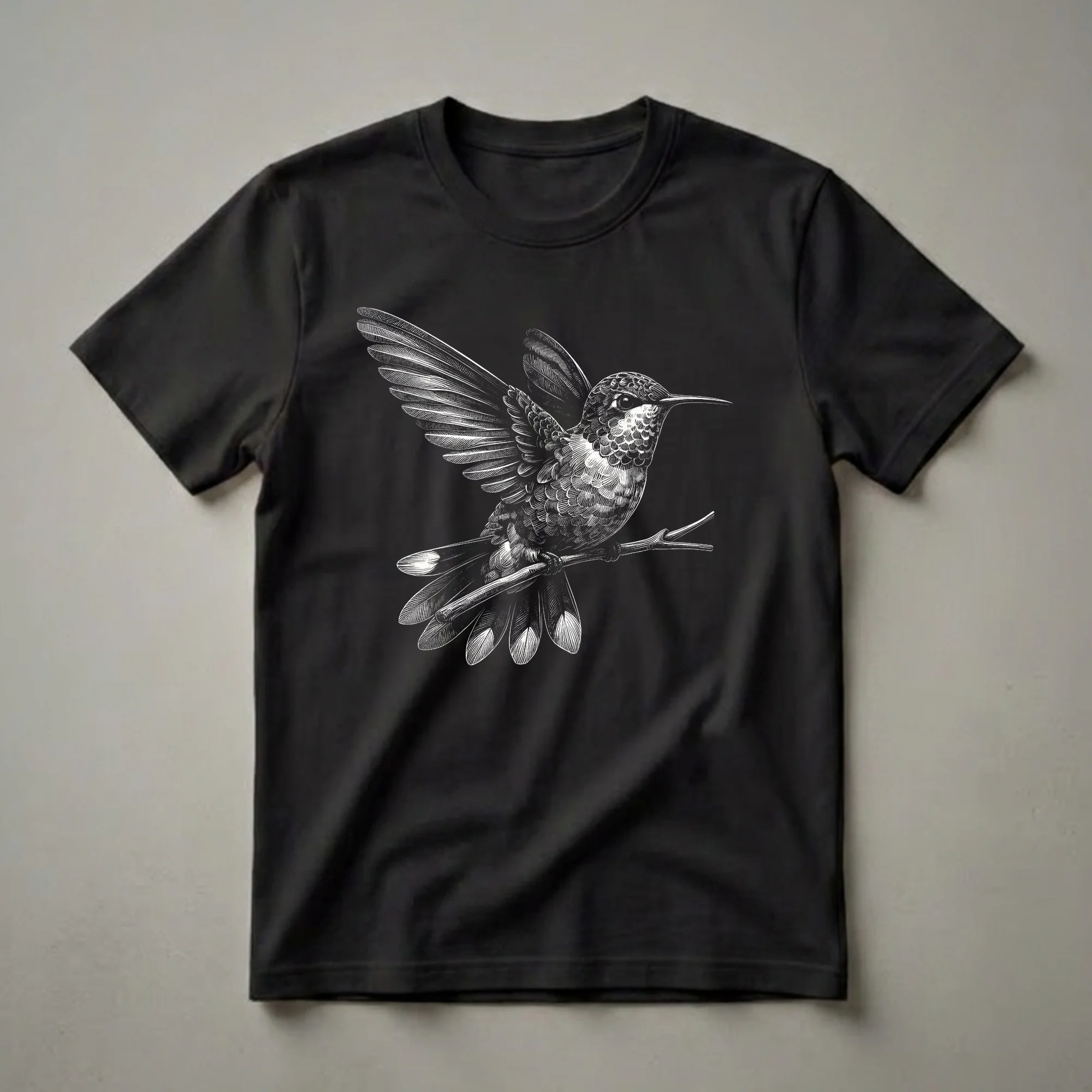 - Hummingbird engraving tee for nature lovers and birdwatchers.