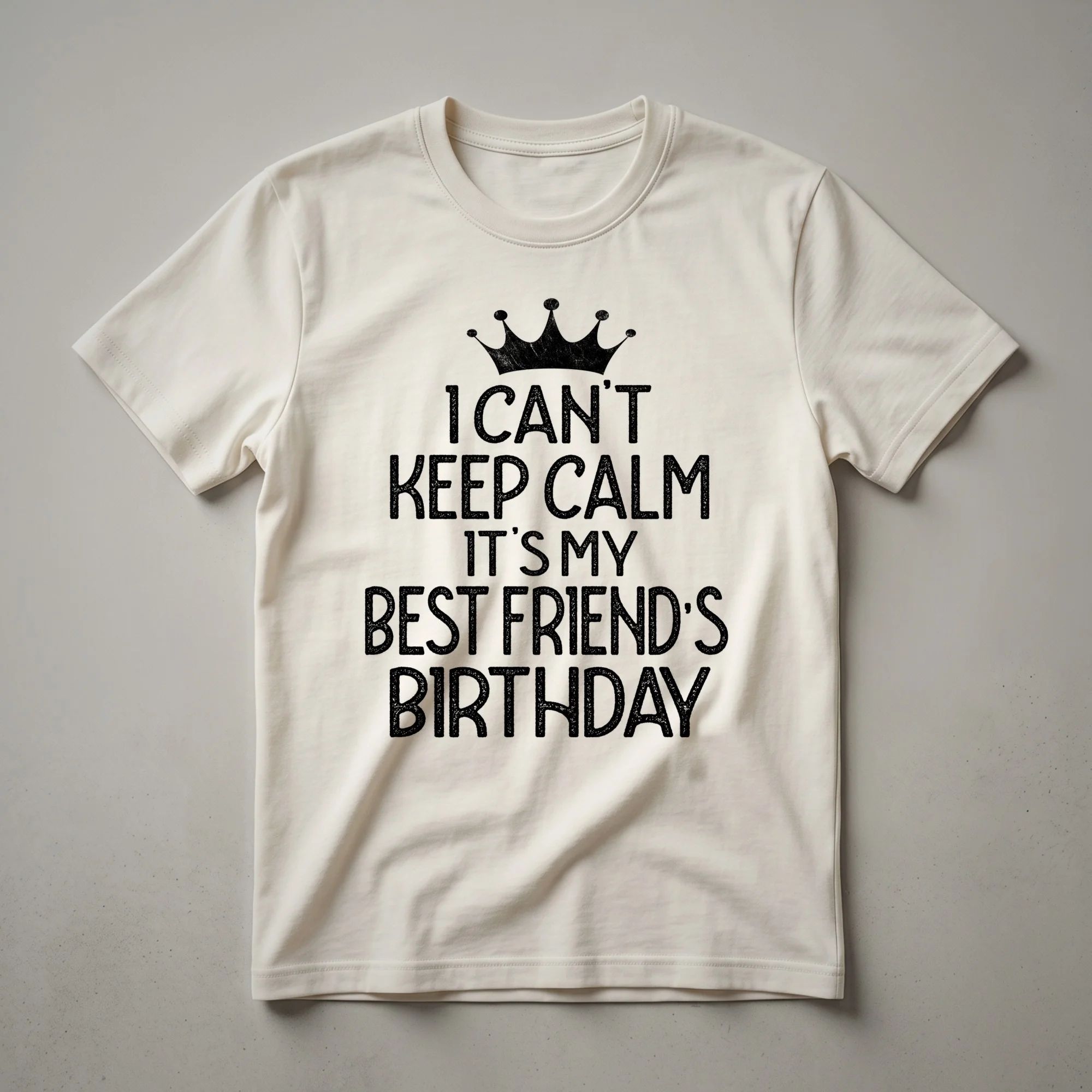 Celebrate your favorite person's big day with this bold, distressed graphic tee proudly declaring it's your best friend's birthday party.This graphic t-shirt captures that excitement with its bold declaration: "I Can't Keep Calm It's My Best Friend's Birthday Party." The distressed font adds a touch of vintage flair, making it a stylish choice for any celebration. This tee is a go-to for anyone who wants to proudly announce their best friend's special day. It's a conversation starter and a clear indicator of your supportive friendship. Imagine wearing this shirt to your best friend's birthday brunch, dinner, or any gathering dedicated to them. It’s a simple yet effective way to share in the joy and make them feel even more celebrated. This shirt is a thoughtful gift idea for your ride-or-die, your confidante, or your partner-in-crime. It's a wearable declaration of your bond, for the friend who is always there for you, through thick and thin. Let this t-shirt be a part of the festivities, adding a fun element to the birthday celebrations and creating lasting memories.