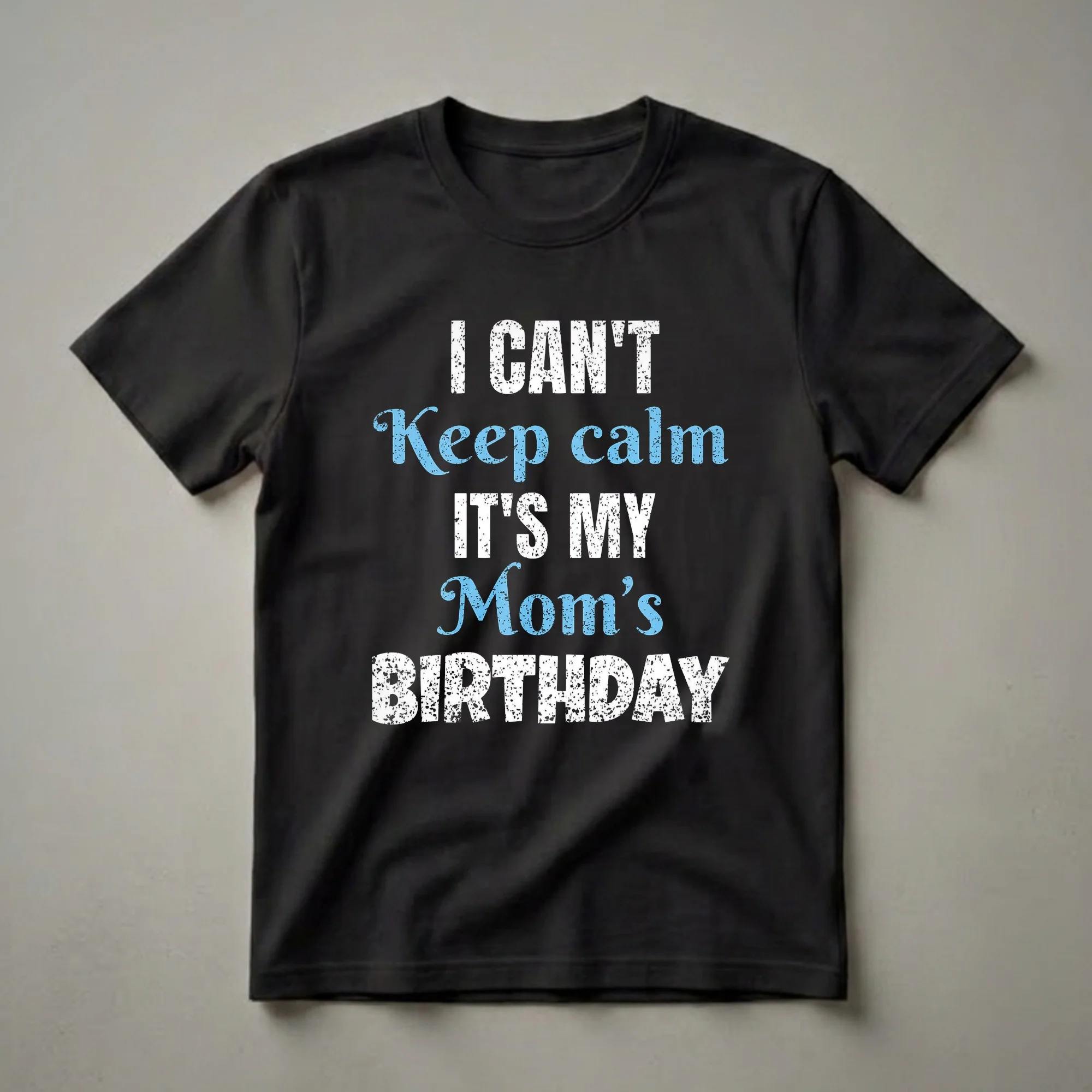 Mom's birthday is a special occasion, and this graphic t-shirt captures the excitement perfectly. The design features bold, distressed lettering that reads "I CAN'T" in white, followed by "Keep calm" in a vibrant blue script font. Below that, "IT'S MY" appears in white, and "Mom's" is in the same blue script. The final line, "BIRTHDAY", is in large, distressed white capital letters. This tee is a fantastic way for a son or daughter to show their enthusiasm for their mother's big day. It's a staple in any birthday celebration wardrobe, great to wear to a birthday brunch, party, or family gathering. This shirt makes a thoughtful gift for any child wanting to express their joy and anticipation for their mom's celebration. It's a fun statement piece that lets everyone know how excited you are for Mom's special day. This shirt is a go-to tee for anyone who wants to make their mom feel extra celebrated.