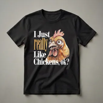 Chicken enthusiasts, rejoice! This striking graphic tee features a close-up illustration of a chicken with wide, expressive eyes and a slightly surprised expression, set against a bold black background. The text 'I Just Really Like Chickens, Ok?' is prominently displayed, declaring your devotion to these fascinating birds. Chickens, belonging to the Gallus gallus domesticus species, are known for their complex social structures and diverse breeds, from the stoic Rhode Island Red to the ornamental Silkie. This t-shirt is a staple in the collection for anyone who finds joy in raising, observing, or simply appreciating the unique charm of chickens. It makes a thoughtful gift for the chicken mom in your life or the farmer who nurtures their flock. Wear this tee to your next farm visit, casual outing, or while attending chicken shows. Add this unique chicken shirt to your wardrobe and let your fowl affection shine.