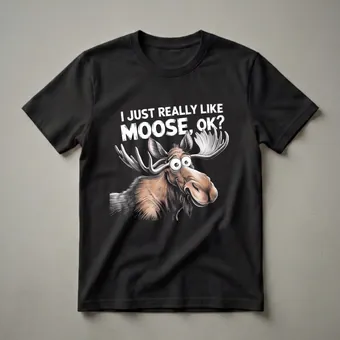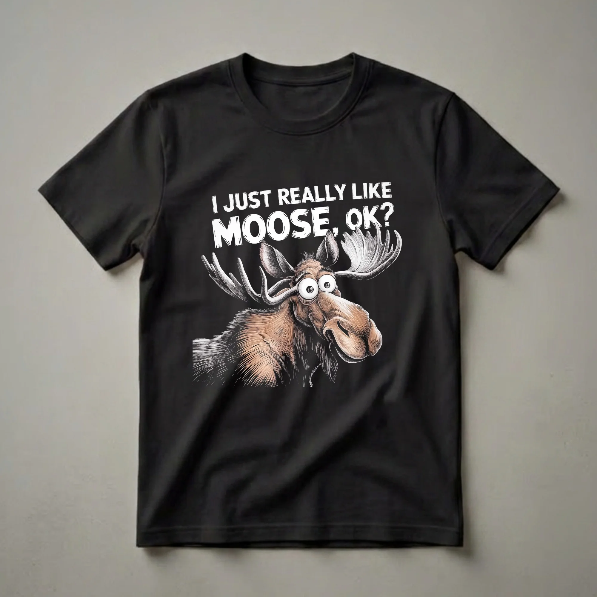 Moose enthusiasts who want to wear their appreciation on their sleeve will reach for this quirky graphic tee. The design features a cartoon moose with wide, expressive eyes and impressively large antlers, set against a plain black background. Bold white text above the moose states, "I JUST REALLY LIKE MOOSE, OK?". This eye-catching t-shirt captures the charmingly eccentric nature of these magnificent North American mammals. Moose, scientifically known as Alces alces, are the largest members of the deer family and inhabit boreal and temperate broadleaf and mixed forests of the Northern Hemisphere. This shirt makes a thoughtful gift for anyone who finds humor in wildlife and wishes to express their unique affection for these gentle giants. It's a go-to tee for casual outings, wildlife viewing trips, or simply lounging around the house.