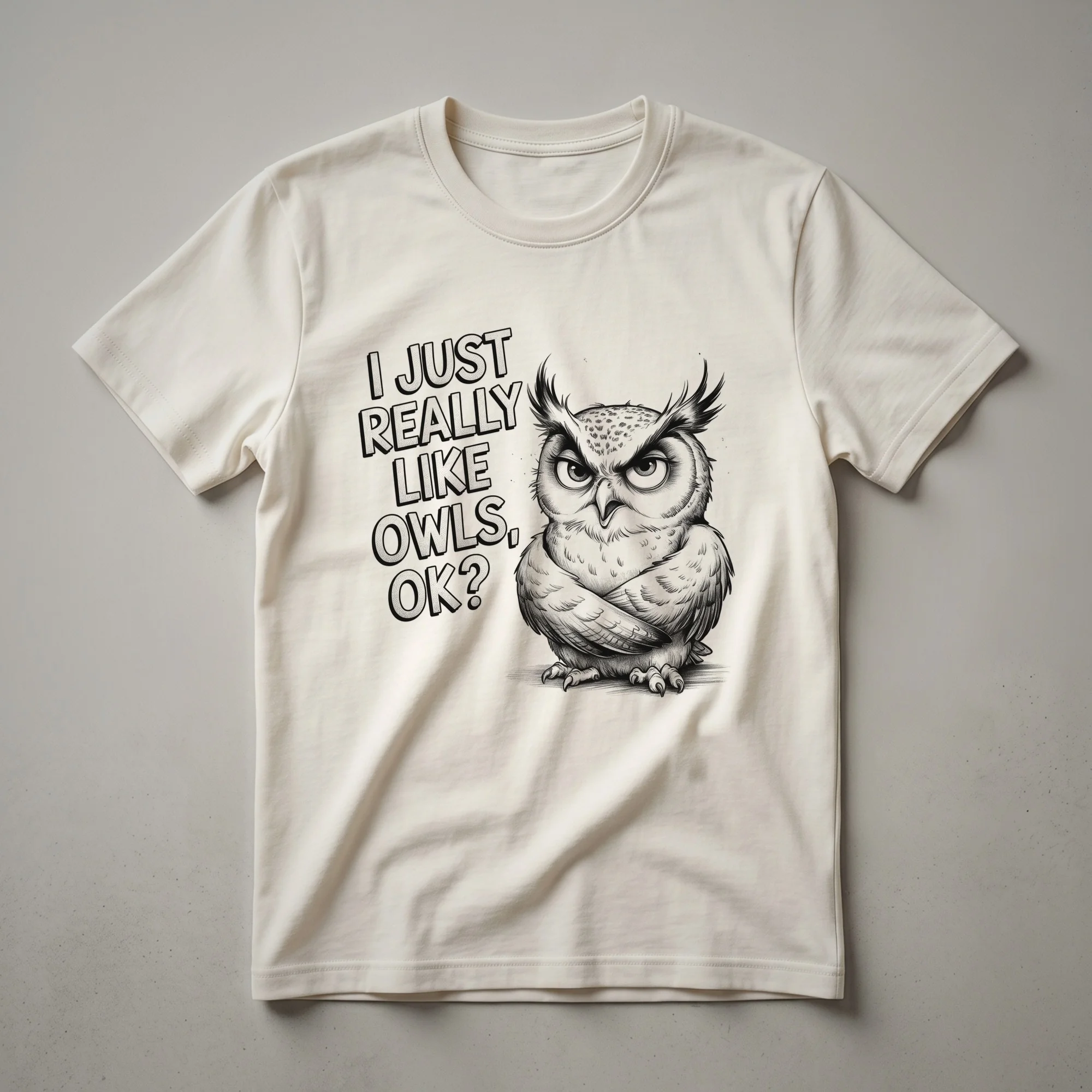 Owl enthusiasts who want to express their fascination with these nocturnal birds will reach for this unique graphic tee. The design features a stylized owl with large, captivating eyes, rendered in a clean, artistic style. Below the owl, the phrase "I Just Really Like Owls, Ok?" is displayed, conveying a straightforward and endearing passion for these fascinating creatures. Owls are known for their silent flight and keen eyesight, making them symbols of wisdom and mystery across many cultures. Species like the Great Horned Owl can be found in diverse habitats across North and South America, while the Barn Owl has a near-global distribution. This shirt is a thoughtful gift for any birdwatcher, ornithologist, or anyone who finds themselves captivated by the enigmatic nature of owls. It’s a comfortable and eye-catching piece of apparel that sparks conversation and celebrates a shared love for these incredible birds. Wear this tee to your next birding expedition, a casual outing, or simply while enjoying a quiet evening, and let your owl admiration shine.