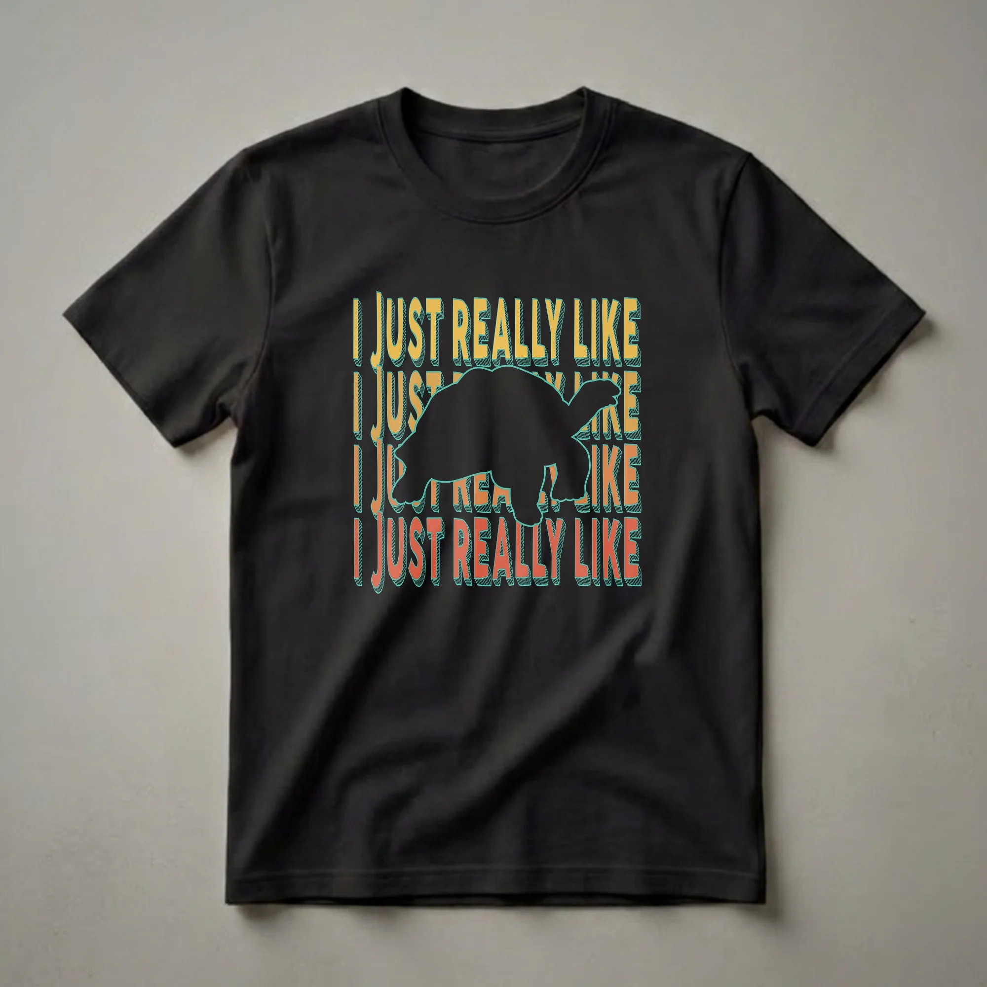 Turtles are fascinating creatures, known for their ancient lineage and slow, deliberate movements. This graphic tee captures that unique charm with a bold, retro design. The phrase "I Just Really Like Turtles" is presented in a repeating pattern with a striking silhouette of a turtle front and center. The text uses a vibrant color palette of yellow, orange, and teal, creating an eye-catching visual that stands out. This shirt is a thoughtful gift for any woman or man who adores these shelled reptiles, whether they are fascinated by sea turtles or land tortoises. It’s a fun way for turtle moms and dads to express their passion. This t-shirt works well for casual outings, game nights, or just lounging around the house. Imagine wearing this to a reptile expo or a casual brunch with fellow animal lovers. The retro style adds a touch of nostalgia, making it a unique addition to any wardrobe. It’s a conversation starter for anyone who appreciates the slow and steady charm of turtles.