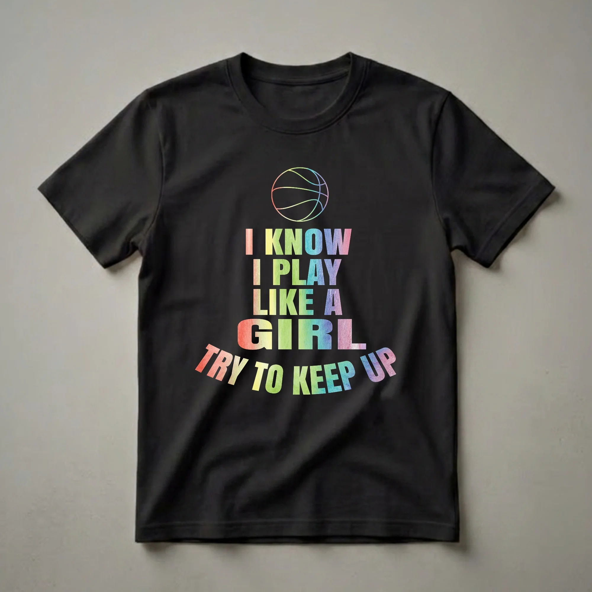 Female basketball players who have outrun, outshot, and out-hustled opponents will connect immediately with this graphic tee. The design stacks I KNOW / I PLAY / LIKE A / GIRL / TRY TO KEEP UP in a funnel shape, each line rendered in rainbow tie-dye watercolor lettering, pinks, purples, greens, and yellows bleeding together in soft gradient bands. At the top, a basketball is outlined in the same multicolor spectrum. Women's basketball has grown dramatically at both the collegiate and professional level, with the WNBA drawing record attendance and viewership in recent seasons. Young girls are growing up watching professional female players as legitimate role models, point guards who run the offense, forwards who box out players a foot taller, shooting guards who hit the three under pressure. The phrase on this shirt turns a common dismissal into a declaration of skill. This shirt works well for girls on school teams, travel squads, or rec league rosters who want their wardrobe to match their competitive spirit. It makes a thoughtful gift for a daughter, niece, or teammate celebrating a birthday or the end of a season. Wear this tee to practice, to a game, or just around the neighborhood to let everyone know where her priorities are. Players at every level, from youth leagues to adult rec ball, reach for statement tees that say what they feel on the court.