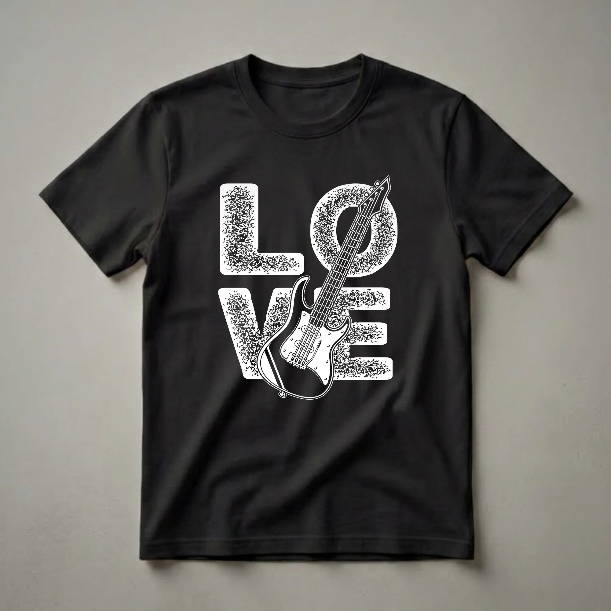 Bass guitarists who want to showcase their love for the instrument will reach for this striking graphic tee. The design features the word 'LOVE' boldly displayed, with a detailed illustration of a bass guitar creatively replacing the letter 'O'. The letters themselves are rendered in a distressed, fragmented style, adding a unique artistic flair to the overall composition. This shirt is a testament to the foundational role the bass guitar plays in music, providing the rhythmic and harmonic backbone for countless songs across genres. From rock and blues to jazz and funk, the bass is essential. This tee works well for musicians who spend hours practicing, performing on stage, or simply jamming with friends. It makes a thoughtful gift for the bassist in your life, whether they are a seasoned professional or an aspiring student. Wear it to band practice, a concert, or just out and about to let everyone know about your passion for the low end.
