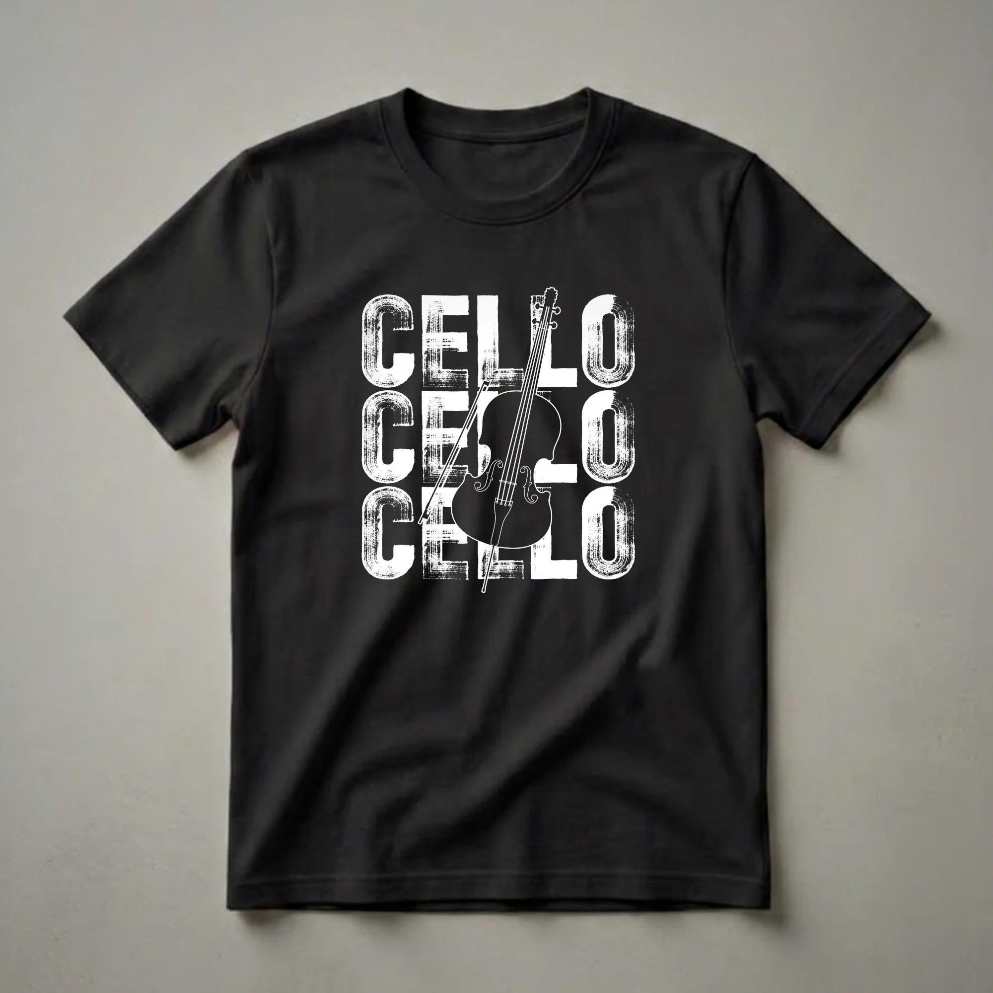 - Features a bold, distressed "CELLO" graphic with a cello silhouette.
