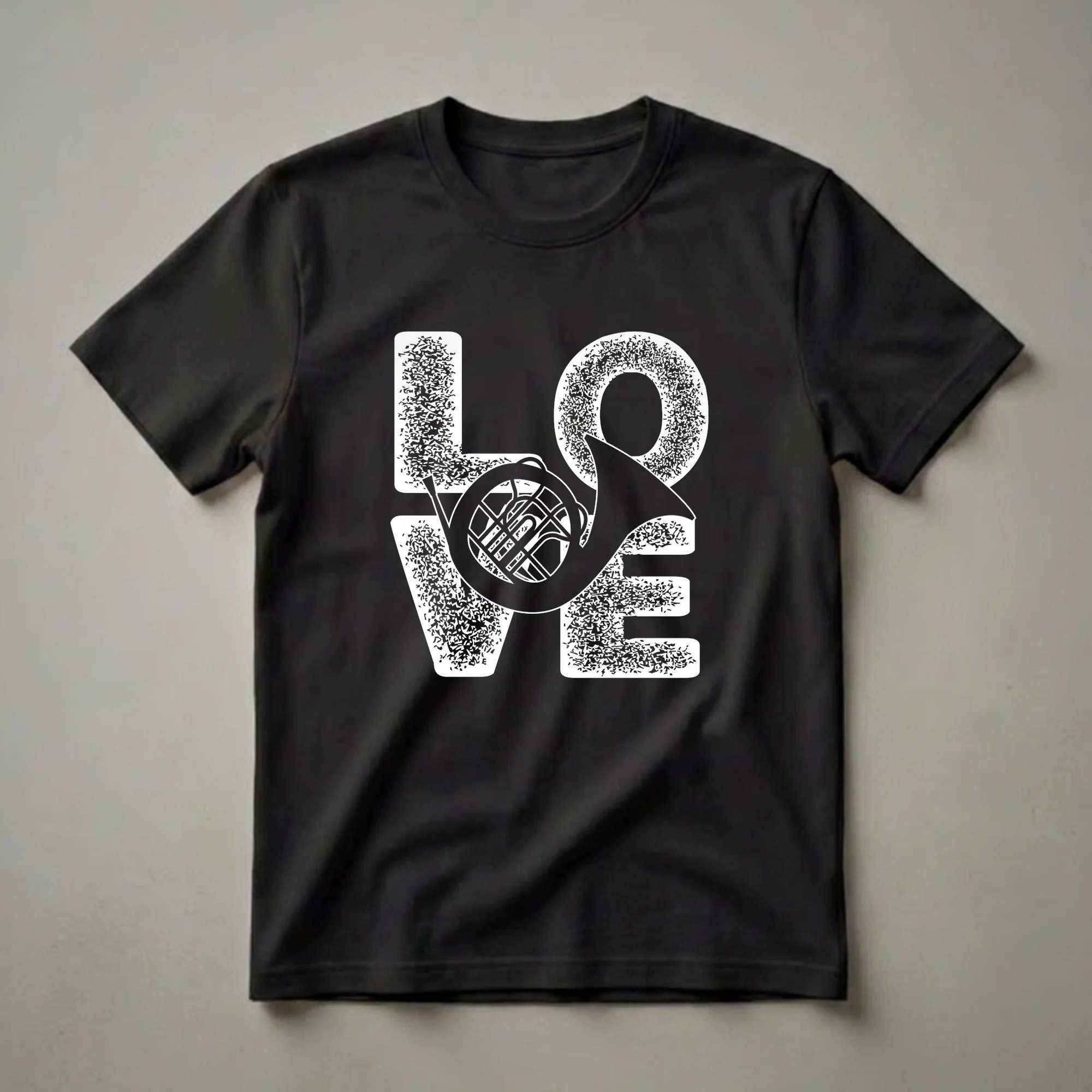 French horn players who want to showcase their dedication will reach for this eye-catching graphic tee. The design features the word 'LOVE' in bold white lettering, with a detailed illustration of a French horn artfully integrated into the 'O'. The French horn itself is a complex brass instrument known for its distinctive mellow tone and wide range, often found in orchestras and chamber ensembles. Its intricate tubing and bell require significant skill to master, making it a challenging yet rewarding instrument to play. This shirt is a perfect way for musicians, students, or fans of orchestral music to express their affection for this beautiful instrument. It makes a thoughtful gift for the French horn enthusiast in your life, whether they are a seasoned professional or just beginning their musical journey. Wear this t-shirt to band practice, concerts, or casual outings to let everyone know about your love for the French horn. It’s a staple in the collection for any brass musician.