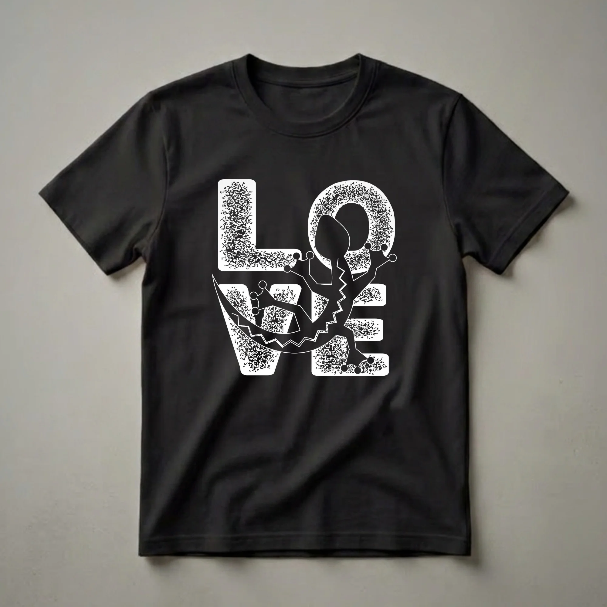 Reptile enthusiasts who adore their scaly companions will appreciate this eye-catching graphic tee. The design features the word 'LOVE' in bold white lettering, with a stylized gecko artfully integrated into the word 'O'. The gecko itself is depicted with a white outline, showcasing its distinctive body shape, long tail, and characteristic toe pads. The letters of 'LOVE' are filled with a unique, fragmented pattern, adding a striking visual texture to the overall design. Geckos, known for their incredible climbing abilities and diverse species, are fascinating creatures found in various habitats worldwide, from tropical rainforests to arid deserts. This shirt is a wonderful way for any gecko mom or gecko dad to express their affection for these unique pets. It makes a thoughtful gift for birthdays, holidays, or just because for the lizard lover in your life. Wear this t-shirt to your next reptile expo, a casual outing with fellow pet owners, or simply while relaxing at home with your favorite gecko.