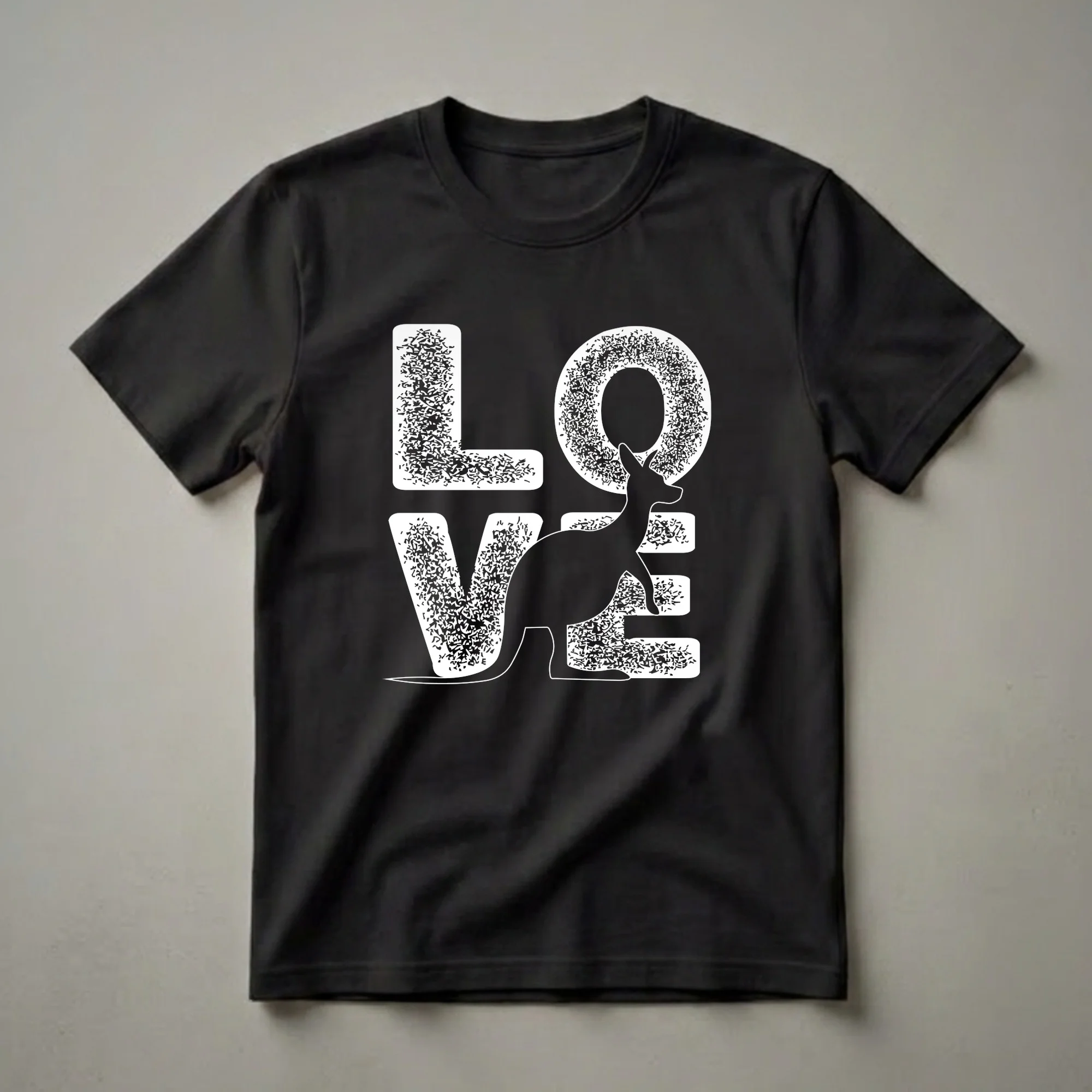 Animal lovers with a deep appreciation for Australia's most iconic marsupial will reach for this retro graphic tee. The design spells out LOVE in large bold white block letters with a rough-edged distressed fill, two letters per row, creating a grid, and places a detailed black kangaroo silhouette squarely within the circular space of the O. The kangaroo's ears, head, and hunched body fit naturally into the letter's shape, making the wordplay feel intentional and satisfying. Kangaroos (family Macropodidae) are marsupials endemic to Australia, where they serve as a national symbol appearing on the country's coat of arms alongside the emu. The red kangaroo (Macropus rufus) is the world's largest marsupial, with males reaching over six feet tall and weighing 200 pounds. Kangaroos are the only large animals to use hopping as their primary means of locomotion, a gait that becomes more energy-efficient at higher speeds, making them one of the most unusual large mammals on earth. Females carry their young, called joeys, in a forward-facing pouch for up to ten months after birth. This shirt works well for wildlife enthusiasts, travelers who visited Australia, animal science students, and anyone who has a real fondness for marsupials. It makes a thoughtful gift for an Australian expat, a wildlife documentary fan, or a child fascinated by animals from faraway places. Wear it to a zoo visit, a nature walk, or just out with friends.