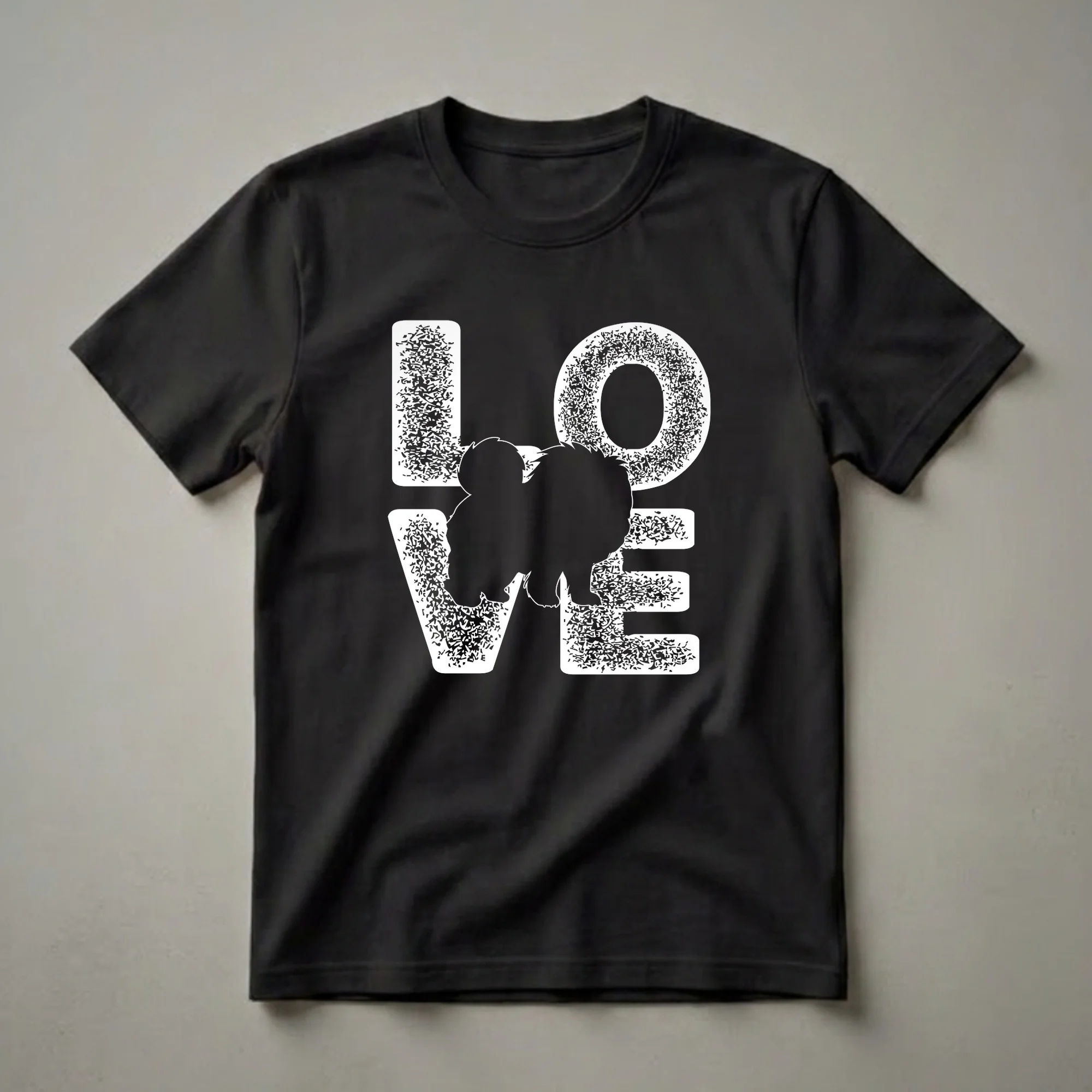 Chow Chow owners know the unique charm and dignified presence of their beloved companions. This graphic tee captures that affection with a striking design that spells out 'LOVE' using a bold, distressed font. Nestled within the letters is the unmistakable silhouette of a Chow Chow, its fluffy mane and characteristic stance instantly recognizable to any breed enthusiast. The stark black and white contrast makes this shirt a visually appealing statement piece for any dog lover. The Chow Chow, originating from northern China, is known for its lion-like appearance and aloof yet loyal nature. This t-shirt is a thoughtful gift for any proud Chow Chow mom or dad who cherishes their furry family member. It's a go-to tee for casual outings, dog park visits, or simply relaxing at home with your canine best friend. Wear your passion for this distinctive breed with pride and let everyone know you're a devoted Chow Chow parent. This shirt is a staple for anyone who believes their Chow Chow is more than just a pet, but a true member of the family.