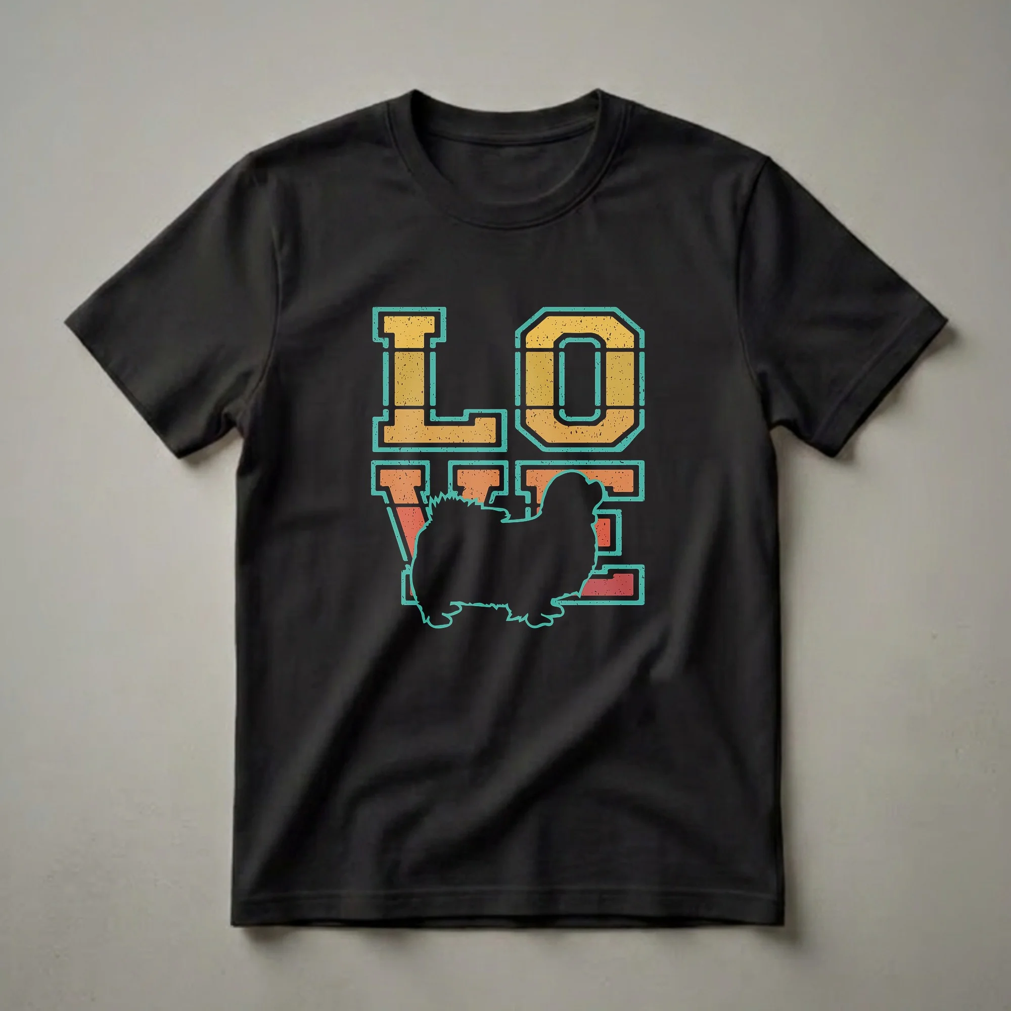 Tibetan Spaniel owners know the unique charm and affectionate nature of these small, alert dogs. This retro-inspired graphic tee features the word 'LOVE' in a distressed, vintage font, with the silhouette of a Tibetan Spaniel artfully replacing the letter 'V'. The design uses a warm color palette of orange, yellow, and red, outlined in teal, evoking a nostalgic feel. Tibetan Spaniels, originating from Tibet, were historically companion dogs for monks and royalty, known for their intelligence and playful spirit. This shirt is a thoughtful gift for any woman who considers herself a devoted dog mom to her Tibetan Spaniel, or for anyone looking to celebrate their canine companion. It's a comfortable and stylish way to express your bond, a thoughtful choice for casual outings, dog park visits, or simply relaxing at home with your beloved pet. This t-shirt is a staple for any Tibetan Spaniel enthusiast's wardrobe, offering a unique way to showcase your passion for this special breed.