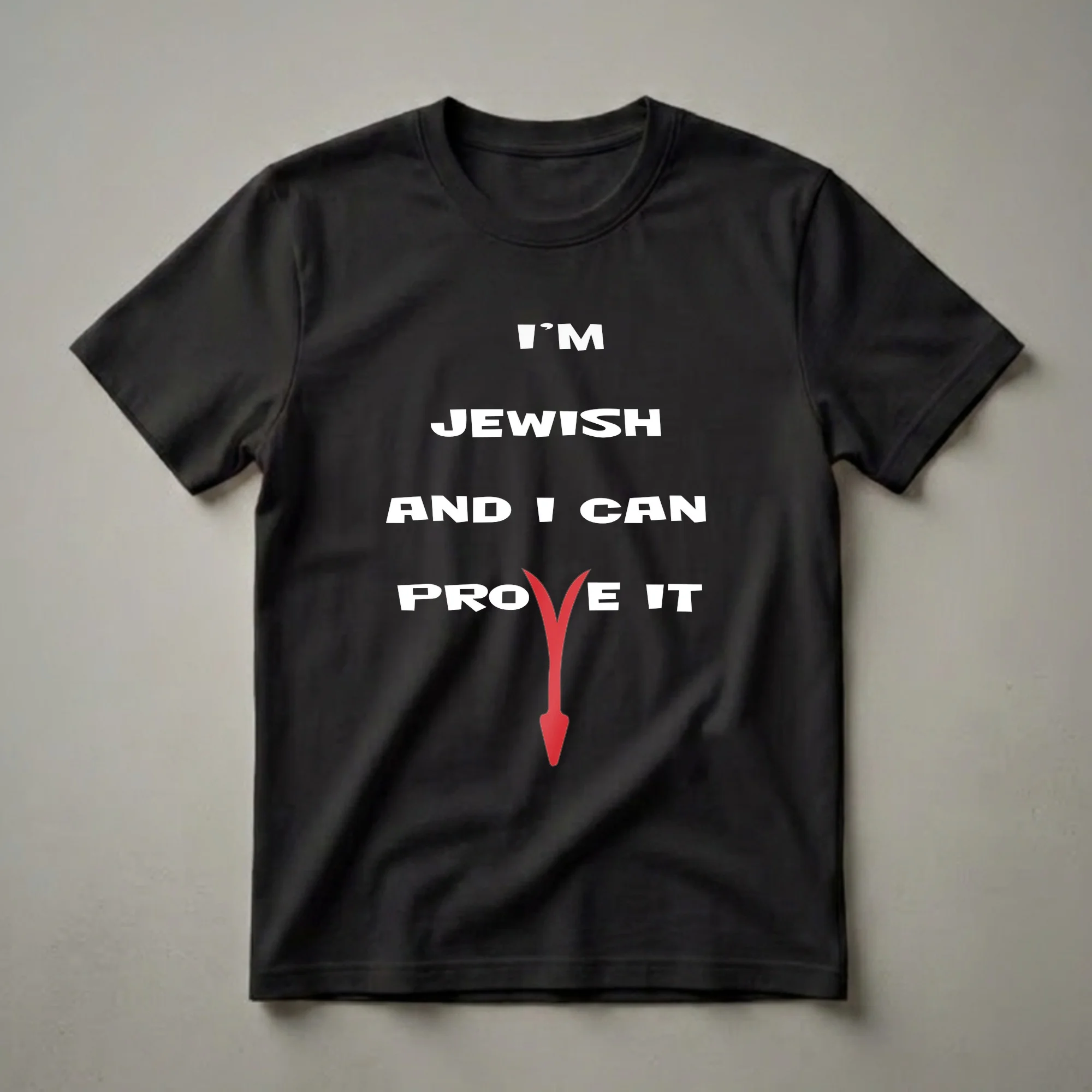 Jewish individuals who want to express their identity with a touch of humor will appreciate this striking graphic tee. The shirt boldly states 'I'M JEWISH AND I CAN PROVE IT' in large white lettering against a solid black background. A stylized red graphic element, resembling a downward-pointing arrow or a stylized letter 'V', is positioned below the text, adding a unique visual accent. This t-shirt serves as a proud declaration of Jewish identity, suitable for cultural events, family gatherings, or everyday wear. It makes a thoughtful gift for friends or family members who wish to celebrate their Jewish roots and share a bit of their heritage with a playful statement. This apparel is a go-to tee for anyone looking to express their connection to Jewish culture and history with confidence and a sense of humor. Wear it to community events or casual outings to spark conversations and share your pride.