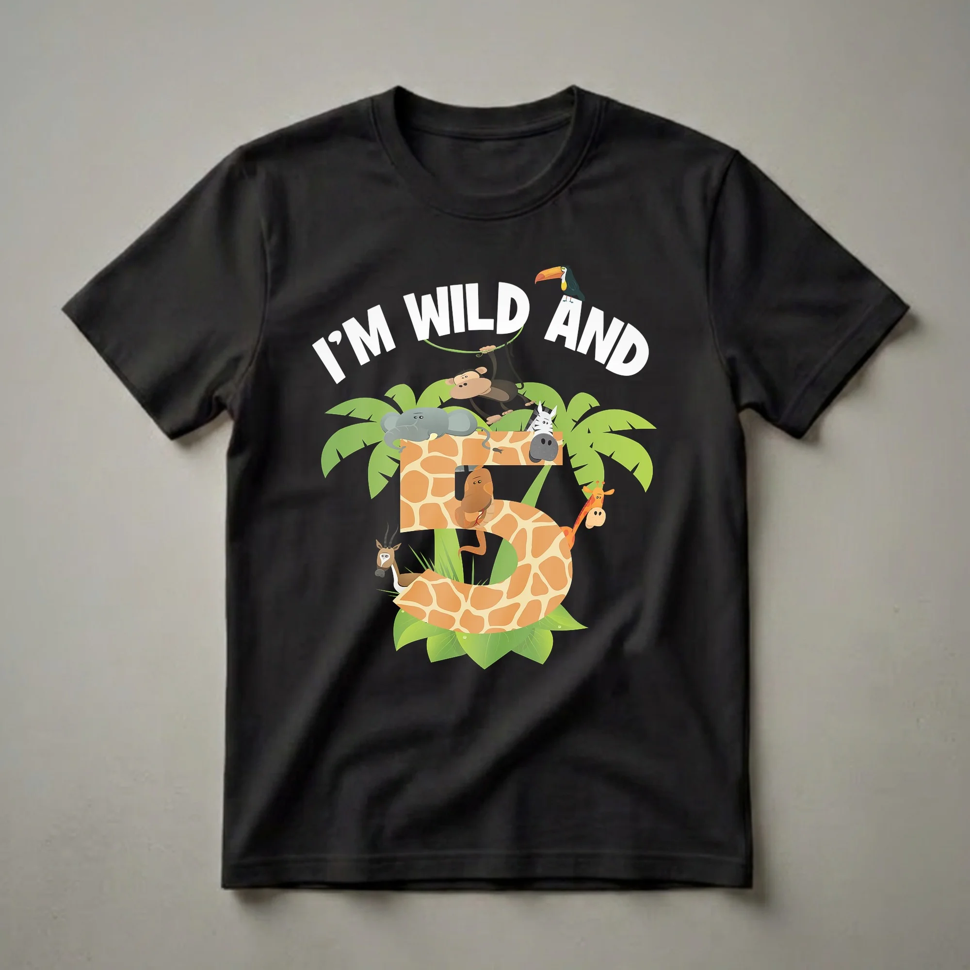 - Giraffe print number '5' is central to the design, surrounded by a monkey, elephant, zebra, toucan, gazelle, and giraffe.