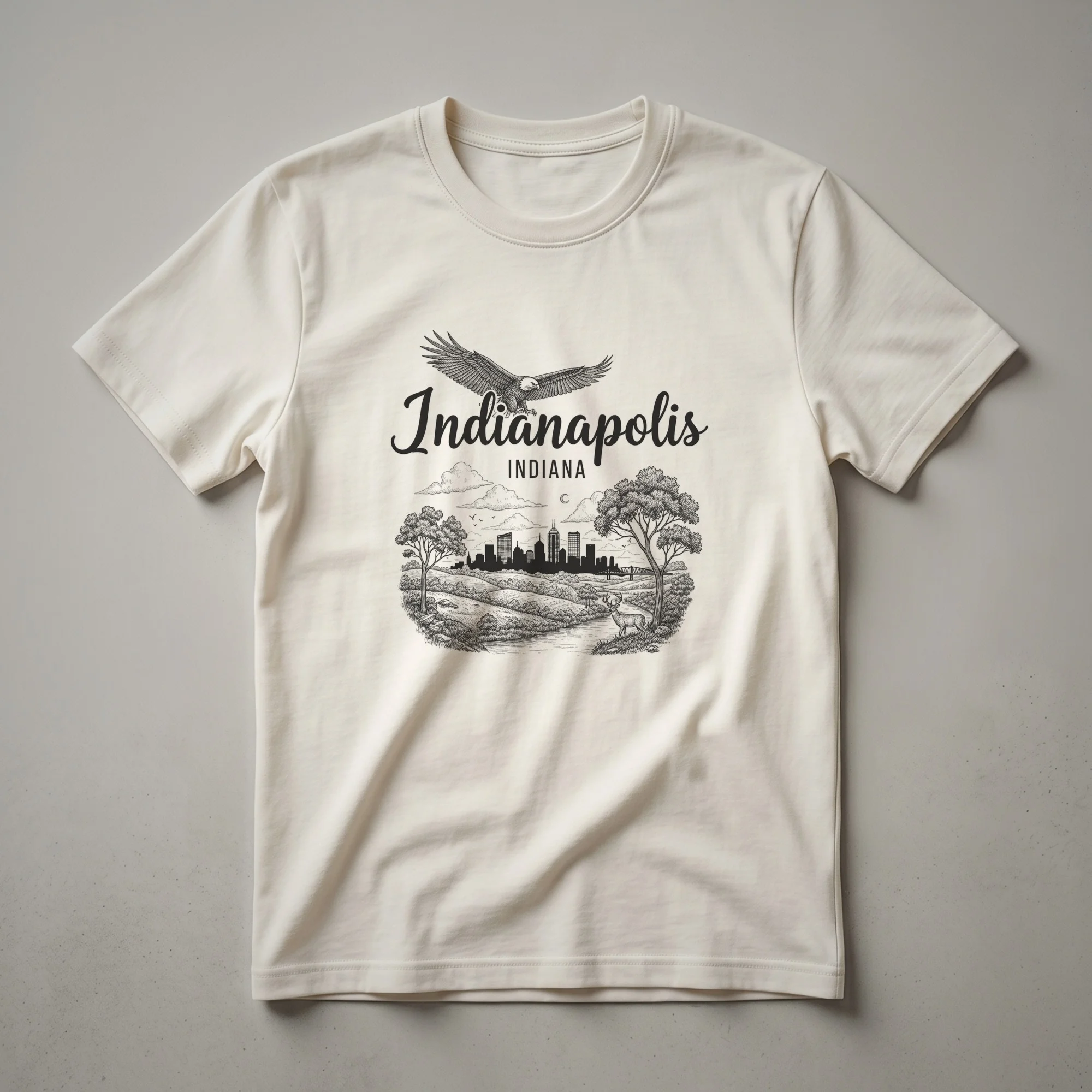 Indianapolis, Indiana, is captured in a striking sketch art design on this t-shirt, appealing to residents and admirers of the Hoosier State's capital. The artwork features the iconic Indianapolis skyline, complete with prominent buildings and a bridge, set against a backdrop of rolling hills and trees. Above the city, a majestic eagle soars, symbolizing freedom and strength, while in the foreground, a deer stands peacefully, representing the natural beauty that surrounds the urban landscape. This tee is a fantastic way for anyone who calls Indiana home, or who has fond memories of visiting, to express their connection to the city. It's a thoughtful gift for someone celebrating their Indiana roots or for a traveler who cherishes their time in Indianapolis. Wear this shirt to local events, casual outings, or while exploring the vibrant city. The detailed line art style gives this graphic tee a timeless and artistic feel, making it a standout piece for any wardrobe. It's a staple for anyone proud to be from Indiana.