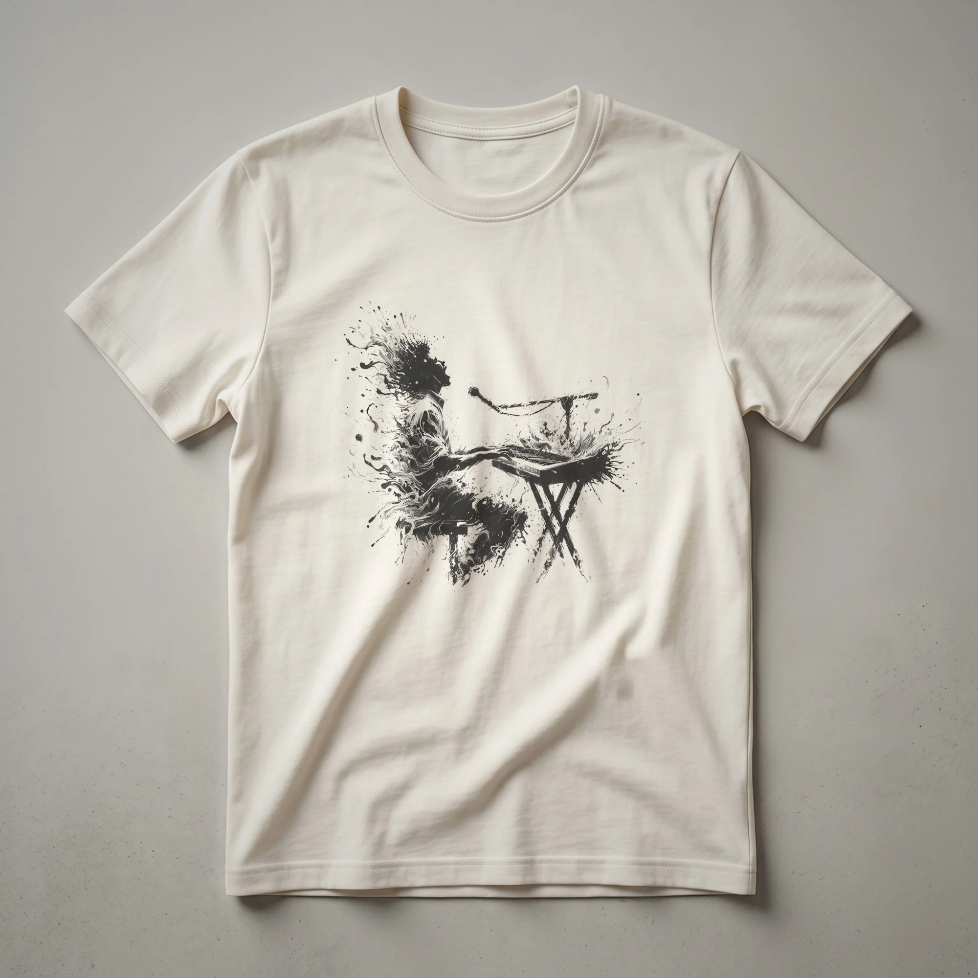 Keyboard players who appreciate artistic expression will reach for this unique graphic tee. The design features a stylized, ink-blot-like drawing of a person seated and playing a keyboard. Splatters and flowing lines create a dynamic, artistic effect, suggesting the fluidity and emotion of music. This t-shirt is a thoughtful gift for pianists, electronic keyboard enthusiasts, or any musician who finds inspiration in the art of playing. The piano, a cornerstone of Western music, has a rich history dating back to the early 18th century, evolving from earlier stringed instruments. This shirt works well for casual outings, music practice sessions, or as a conversation starter among fellow music lovers. It’s a staple in the collection for anyone who loves to create melodies and harmonies. Wear it to your next jam session or simply to express your love for the instrument. This apparel is a go-to tee for those who find joy in every note.