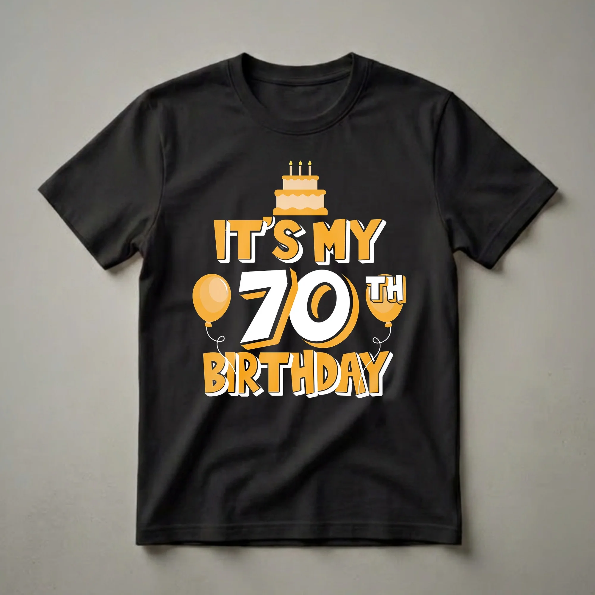 Turning seventy is a significant milestone, and this vibrant graphic tee is a fun way to celebrate. The design prominently displays "IT'S MY 70TH BIRTHDAY" in bold, eye-catching orange and white lettering, accented with a festive birthday cake topped with three candles and two cheerful orange balloons. This t-shirt is a thoughtful gift for anyone celebrating their 70th birthday, whether it's a father, mother, grandparent, or friend. It's a great conversation starter for any birthday party, family gathering, or casual get-together. The bold design ensures the birthday person feels celebrated and special on their big day. This shirt works well for both men and women who want to proudly announce their milestone birthday. Wear it to your birthday brunch or evening celebration to add a touch of festive spirit. Make their 70th birthday memorable with this unique birthday shirt.