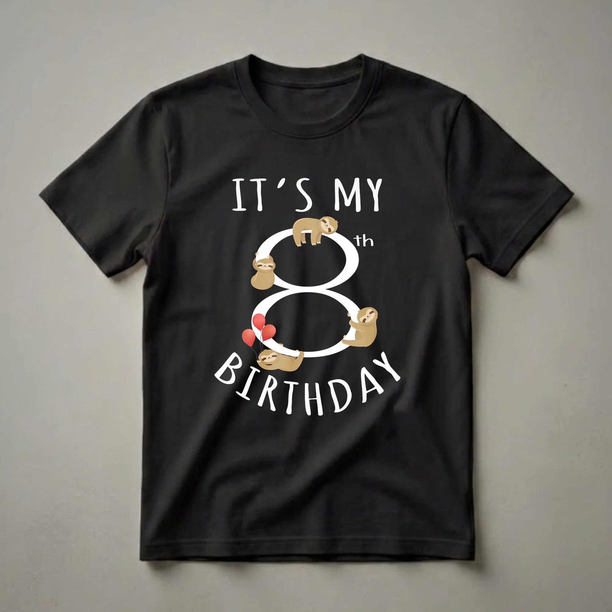 Eight-year-olds are entering a new phase of childhood, and this "It's My 8th Birthday" sloth tee is the perfect way for them to celebrate. The design showcases a large, bold white number '8' that serves as the centerpiece, playfully adorned with four adorable cartoon sloths. One sloth hangs from the curve of the '8', another rests on top, a third dangles from a string of three red balloons, and the fourth is shown in a relaxed pose, clinging to the side. The words "IT'S MY" are printed above the number, and "BIRTHDAY" is written below in a whimsical font, completing the festive look. Sloths are known for their slow, deliberate movements and gentle nature, making them a unique and endearing choice for a birthday theme. This graphic shirt is a thoughtful gift for any child turning eight who loves these unique creatures. It's a fun piece of apparel that can be worn to a birthday party, a casual get-together, or just for everyday wear, bringing a smile to everyone who sees it. This t-shirt is a fantastic way for an eight-year-old to show off their special day with a touch of playful charm.