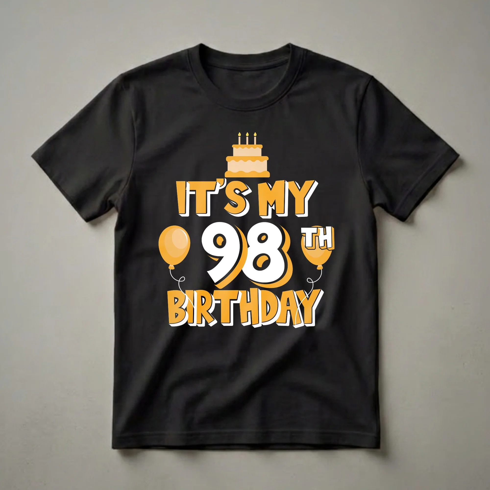 Ninety-eight years is a remarkable milestone, and this vibrant graphic tee is a celebratory way to mark the occasion. The design prominently features the number '98' in large, bold white and orange lettering, signifying the age. Above it sits a cheerful two-tiered birthday cake topped with three lit candles, evoking a sense of festivity. Flanking the large number are two bright orange balloons, adding to the party atmosphere. The words 'IT'S MY' are positioned above the '98', and 'BIRTHDAY' is displayed below, completing the celebratory message. This shirt is a thoughtful gift for anyone celebrating their 98th birthday, whether it's a parent, grandparent, or friend. It's a fun way for the birthday person to express their joy and share their special day with others. This t-shirt works well for birthday parties, family gatherings, or casual wear during birthday celebrations. Imagine the birthday honoree wearing this tee to their party, receiving compliments and sharing smiles. It's a simple yet effective way to highlight a significant birthday and create lasting memories. This eye-catching apparel is a fantastic conversation starter and a wearable memento of a very special year.