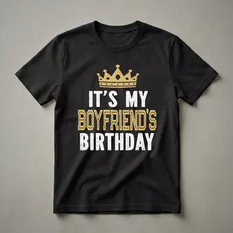 Girlfriends who want to show their support for their significant other's special day will reach for this eye-catching graphic tee. The design features a prominent golden crown with a textured, glittering effect, symbolizing royalty and celebration. Below the crown, the phrase "IT'S MY" is displayed in distressed white lettering, creating a vintage feel. The central text, "BOYFRIEND'S", is rendered in a bold, outlined gold font, also with a textured, glittering appearance, making it stand out. The bottom line, "BIRTHDAY", is presented in the same distressed white lettering as the top line. This t-shirt is a thoughtful gift for any girlfriend looking to make her boyfriend's birthday party memorable. It's a fun way to announce your role and celebrate together. Wear this shirt to his birthday dinner, party, or any casual gathering to show your celebratory spirit. This shirt is a staple for any girlfriend wanting to mark the occasion. The distressed lettering adds a touch of retro flair, making this a unique piece of apparel.