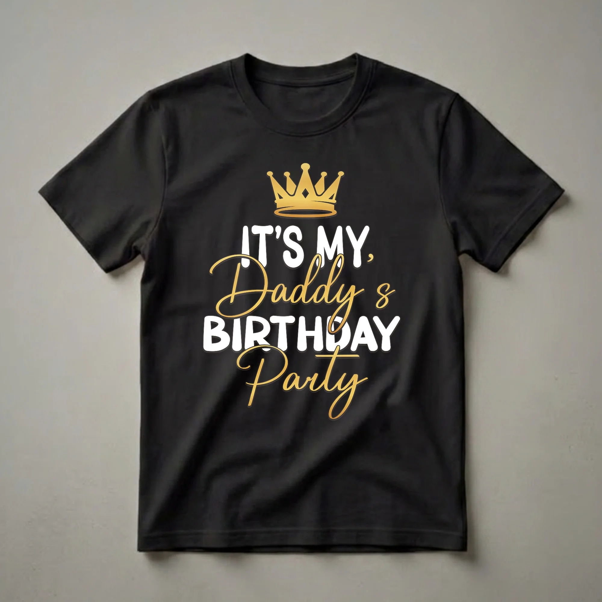 Kids can show their love for their dad on his special day with this 'It's My Daddy's Birthday Party' t-shirt. The design features a regal golden crown positioned above bold white text that declares 'IT'S MY,' followed by 'Daddy's' in elegant gold script. Below this, 'BIRTHDAY' is written in large white block letters, and 'Party' is presented in a flowing gold script, completing the festive look. This graphic tee is a thoughtful gift for any child wanting to make their father feel like a king on his birthday. It's a wonderful way for children to participate in the celebration and show their excitement for Daddy's big day. This shirt works well for birthday parties, family gatherings, or even just a casual day out during the birthday week. Imagine the smiles when Daddy sees his little one sporting this celebratory shirt. It's a staple in any birthday kid's wardrobe, ready for the festivities.