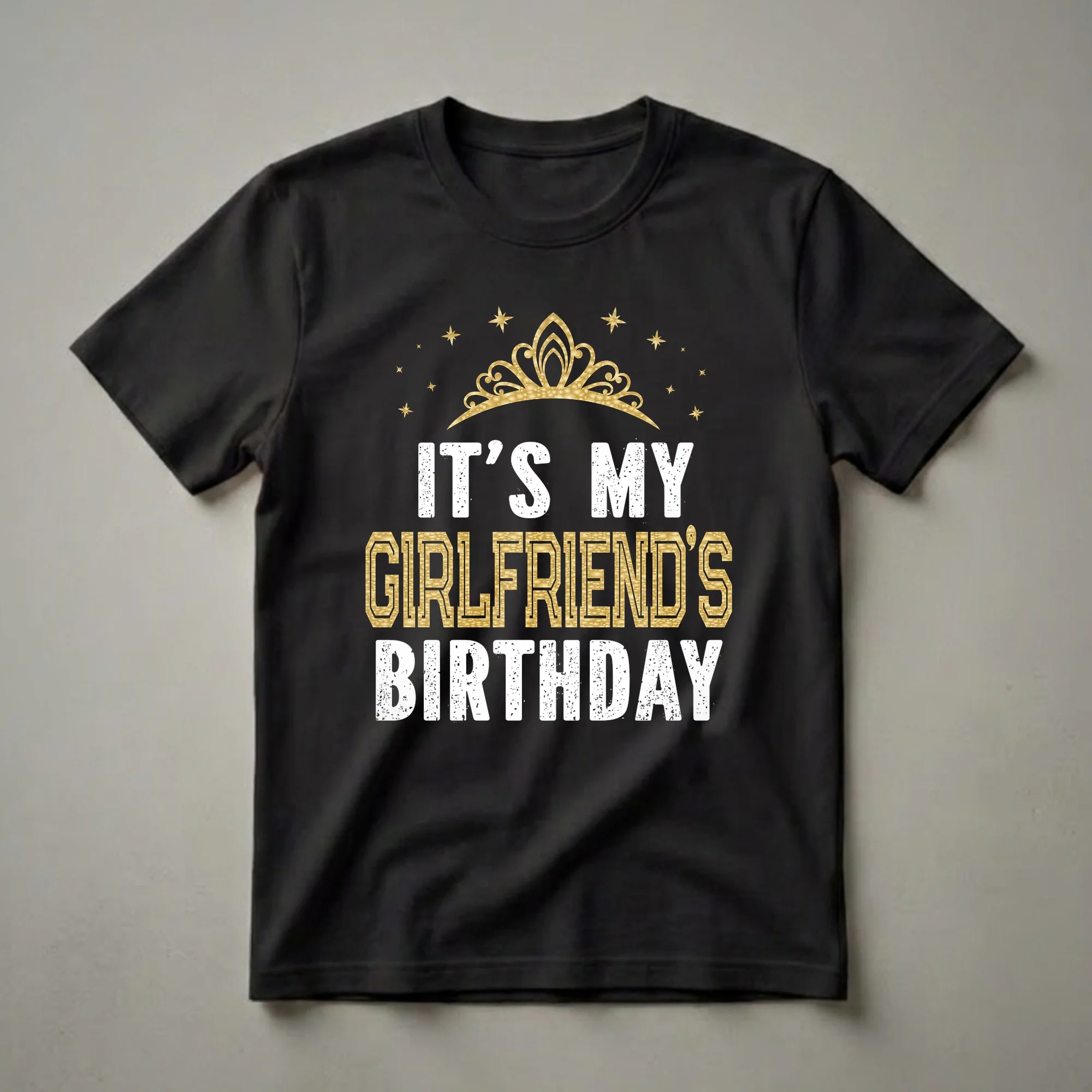 Celebrate your girlfriend's special day with this striking graphic tee that proudly declares "It's My Girlfriend's Birthday." This shirt is worn by the supportive partner who wants to share in the birthday excitement. The design features a regal golden crown adorned with sparkling stars, set against a classic black background. The text is presented in a bold, distressed white font for the main message, while "GIRLFRIEND'S" is highlighted in a shimmering gold, mimicking a luxurious, textured finish. This t-shirt is a thoughtful gift for any boyfriend or partner looking to make their girlfriend's birthday celebration even more memorable. It's a fun way to show your affection and join in the festivities, whether you're heading to a birthday dinner, a party, or a casual get-together. This shirt works well for boyfriends who want to stand out and show their girlfriend they are celebrating her. It's a unique way to express your role in her birthday celebration, making it a go-to tee for the occasion. Imagine the smiles and compliments you'll receive when you wear this to her birthday party. It’s a conversation starter and a sweet declaration of your relationship.