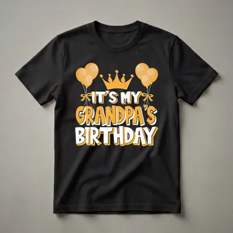 Commemorate Grandpa's special day with this fun graphic t-shirt featuring celebratory balloons, a royal crown, and vibrant text. This graphic tee proudly declares 'It's My Grandpa's Birthday' in bold, eye-catching orange and white lettering, accented by a regal golden crown and festive orange balloons. The design is set against a classic black background, making the vibrant text pop. This shirt is a fantastic way for grandchildren to show their love and excitement for their grandpa's special day. Imagine the smiles when the whole family wears matching shirts to celebrate Grandpa's milestone. This tee works well for birthday parties, family gatherings, or even a casual brunch to honor him. It makes a thoughtful gift for any grandpa who loves to be celebrated by his family. The playful design captures the spirit of a fun birthday celebration, making it a cherished item for years to come. This t-shirt is a simple yet impactful way to make Grandpa feel extra special on his birthday.