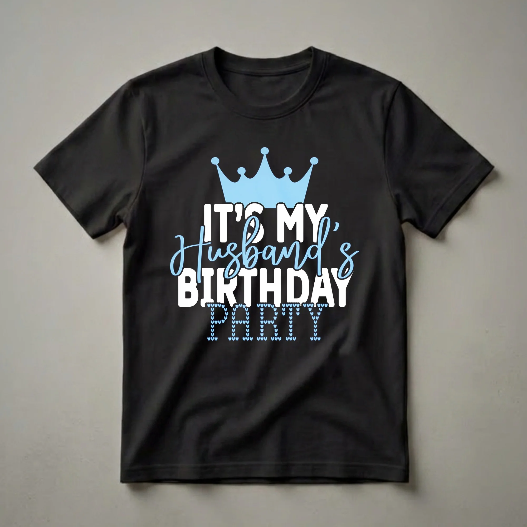 Wives looking to celebrate their husband's special day will reach for this festive birthday party tee. The design prominently features a light blue crown, symbolizing royalty and celebration, positioned above bold white text that declares, "IT'S MY Husband's BIRTHDAY PARTY." The word "PARTY" itself is creatively rendered using a pattern of small, light blue hearts, adding a touch of playful affection to the announcement. This t-shirt is a clear and joyful declaration, great to wear to a birthday dinner, a surprise party, or any gathering honoring the husband. It serves as a fun way to share the occasion with friends and family, making it known who the guest of honor is. Birthdays are significant milestones, and this shirt helps mark the occasion with a clear, celebratory message. It makes a thoughtful gift from a wife to her husband, or even from friends who are organizing a surprise celebration for him. Wearing this shirt announces the festive spirit and the reason for the gathering, ensuring everyone knows it's time to celebrate the husband.
