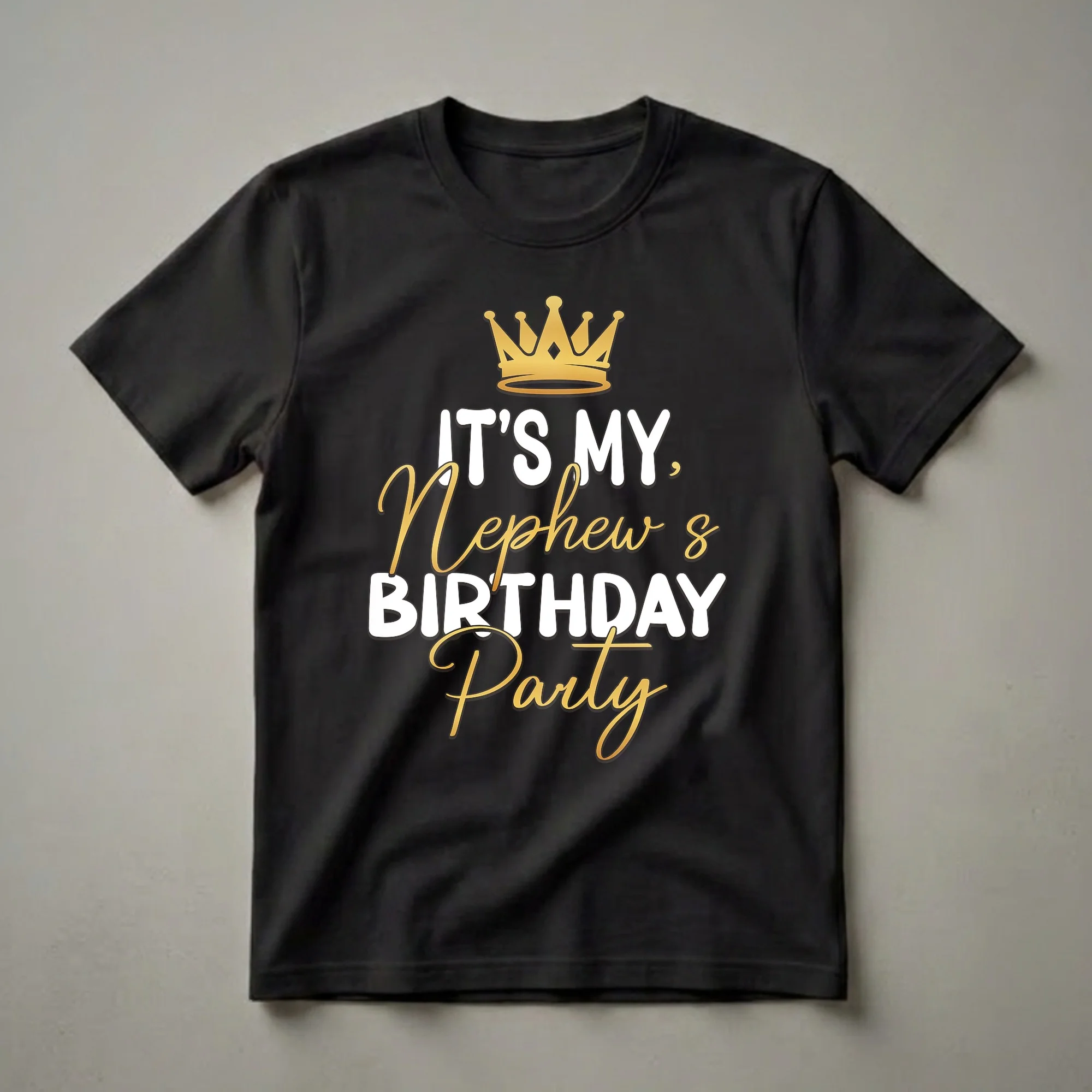 Aunties and uncles who want to show their support for their favorite nephew's special day will reach for this festive t-shirt. The design features a prominent golden crown at the top, symbolizing royalty and celebration. Below the crown, the phrase "IT'S MY" is displayed in bold white lettering, followed by "Nephew's" in elegant, flowing gold script. The words "BIRTHDAY PARTY" are presented in large, impactful white letters, completing the celebratory message. This graphic tee is a thoughtful gift for any aunt or uncle attending their nephew's birthday bash, allowing them to coordinate their attire and share in the excitement. It's a fun way to mark the occasion and show family pride. Imagine wearing this shirt to the birthday party, creating a unified look with other family members who might also be celebrating the special day. This shirt is a staple for any family member wanting to be part of the birthday fun.