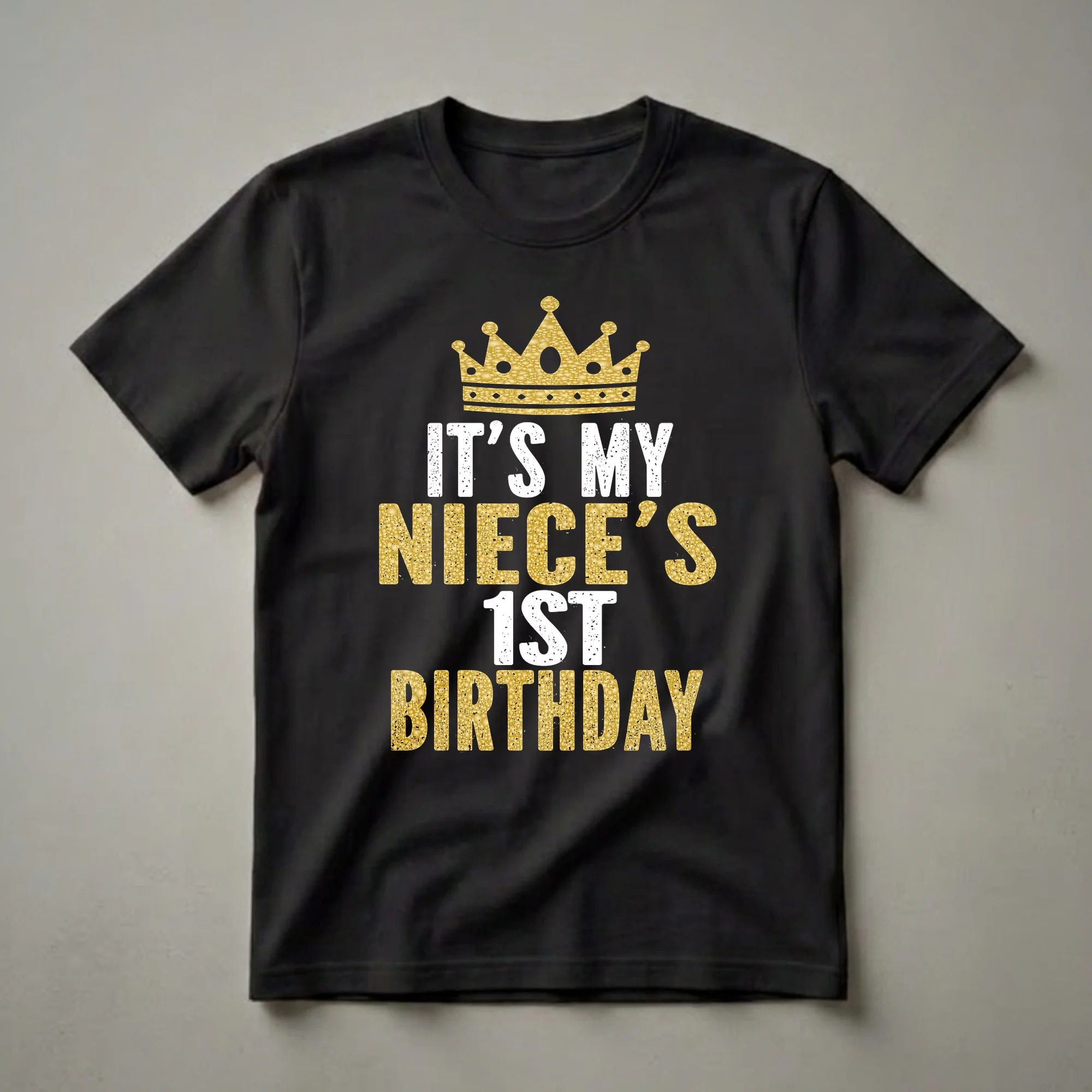 Aunties and uncles who want to celebrate their niece's milestone first birthday will reach for this festive tee. The design prominently features a sparkling golden crown, symbolizing the special status of the birthday girl. Below the crown, the text 'IT'S MY NIECE'S 1ST BIRTHDAY' is displayed in a distressed font, with 'IT'S MY' and '1ST BIRTHDAY' in white, and 'NIECE'S' in a shimmering gold texture. This shirt is a wonderful way for family members to show their love and participate in the celebration. The first birthday is a significant milestone, marking a full year of growth and joy for the child and the entire family. This graphic tee is a thoughtful gift for any aunt, uncle, or other family member who wants to commemorate this special occasion. Wear this shirt to the birthday party, family gathering, or any event celebrating the little one's big day. It's a fun way to coordinate with other family members and create lasting memories.