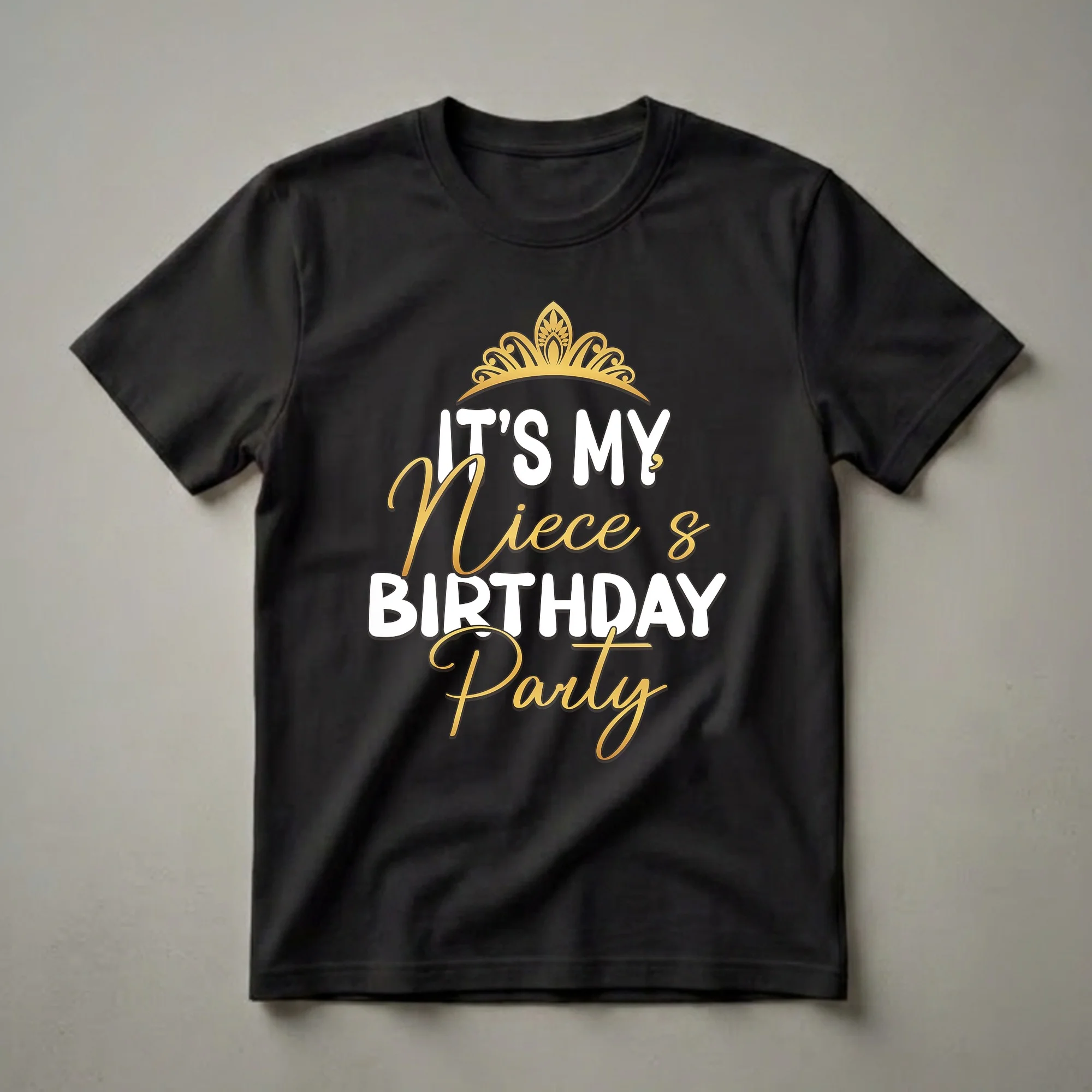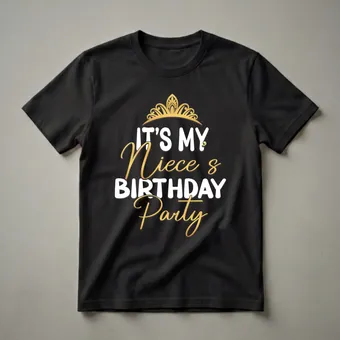 Aunties and uncles who want to show their niece some extra love on her special day will reach for this festive birthday party tee. The design features a golden crown atop bold white text that reads "IT'S MY" and "BIRTHDAY", with the word "Niece's" and "Party" rendered in elegant, flowing gold script. This shirt is a fantastic way to coordinate with other family members attending the celebration, creating a unified and joyful atmosphere. It's a thoughtful gift for any aunt or uncle looking to make their niece's birthday party even more memorable. Imagine the smiles and photos when everyone is wearing their matching birthday shirts, celebrating the guest of honor. This t-shirt is a staple for any family member wanting to be part of the birthday fun. Wear it to the party, to brunch, or any event celebrating your niece. This matching apparel is a wonderful way to create lasting memories.