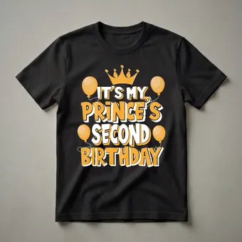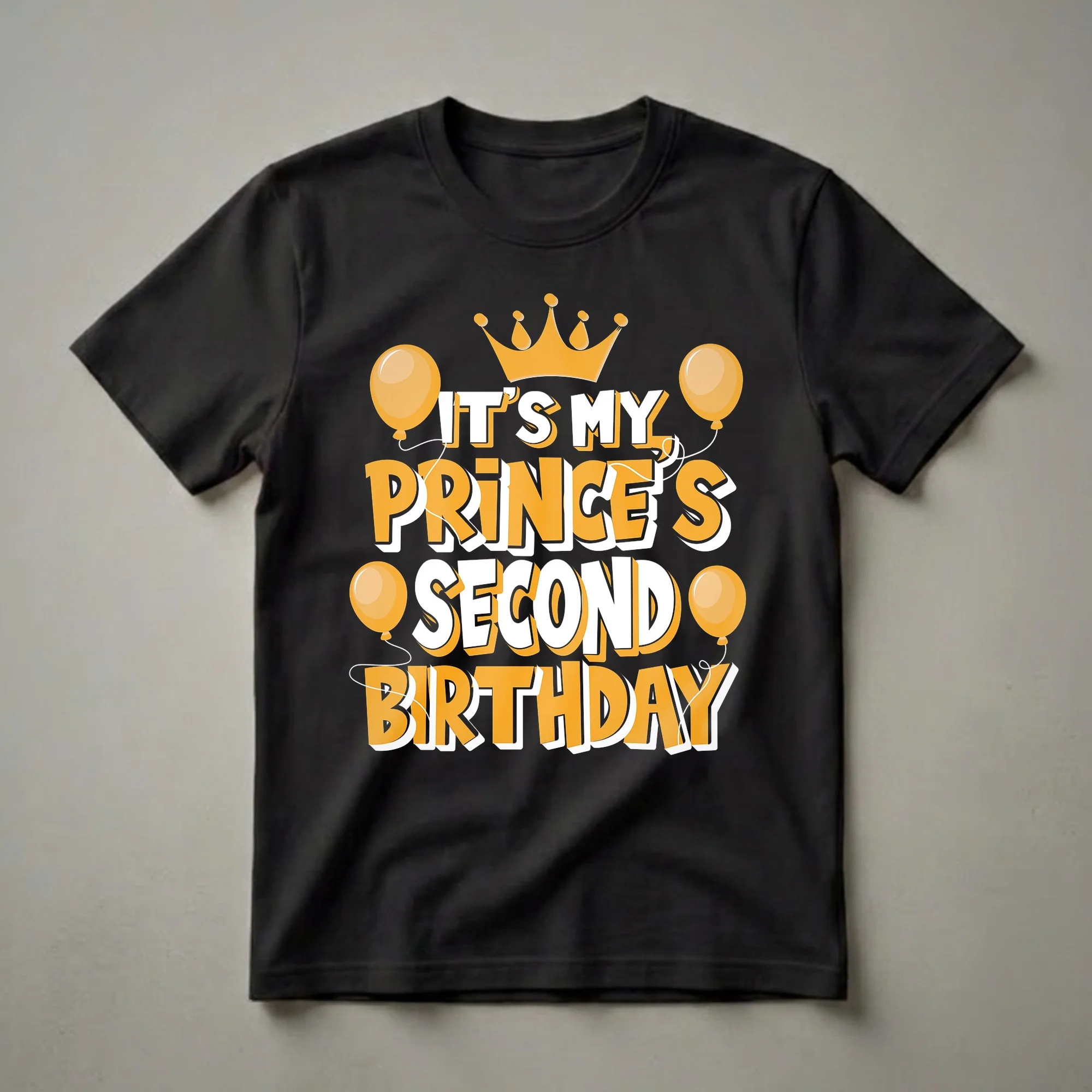 - "It's My Prince's Second Birthday" t-shirt for a 2-year-old boy, featuring a crown and balloons.