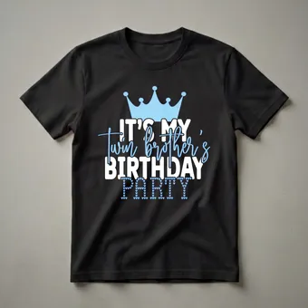 Siblings who share a birthday with a twin brother will reach for this eye-catching graphic tee to celebrate his special day. The design features a prominent light blue crown, symbolizing royalty and celebration, positioned above bold white lettering that declares 'IT'S MY'. Below this, the phrase 'Twin brother's' is written in a flowing, light blue cursive script, adding a personal touch. The word 'BIRTHDAY' appears in large, solid white capital letters, anchoring the design. Completing the graphic, the word 'PARTY' is creatively formed using numerous small, light blue heart shapes, adding a festive and affectionate element. This t-shirt is a thoughtful gift for any sibling looking to make their twin brother's birthday celebration even more memorable. It's a fun way to express sibling pride and join in the birthday festivities, whether at a party, a family gathering, or a casual get-together. Wearing this shirt shows a strong connection and shared joy for the occasion, making it a unique birthday apparel choice for the proud twin sibling.