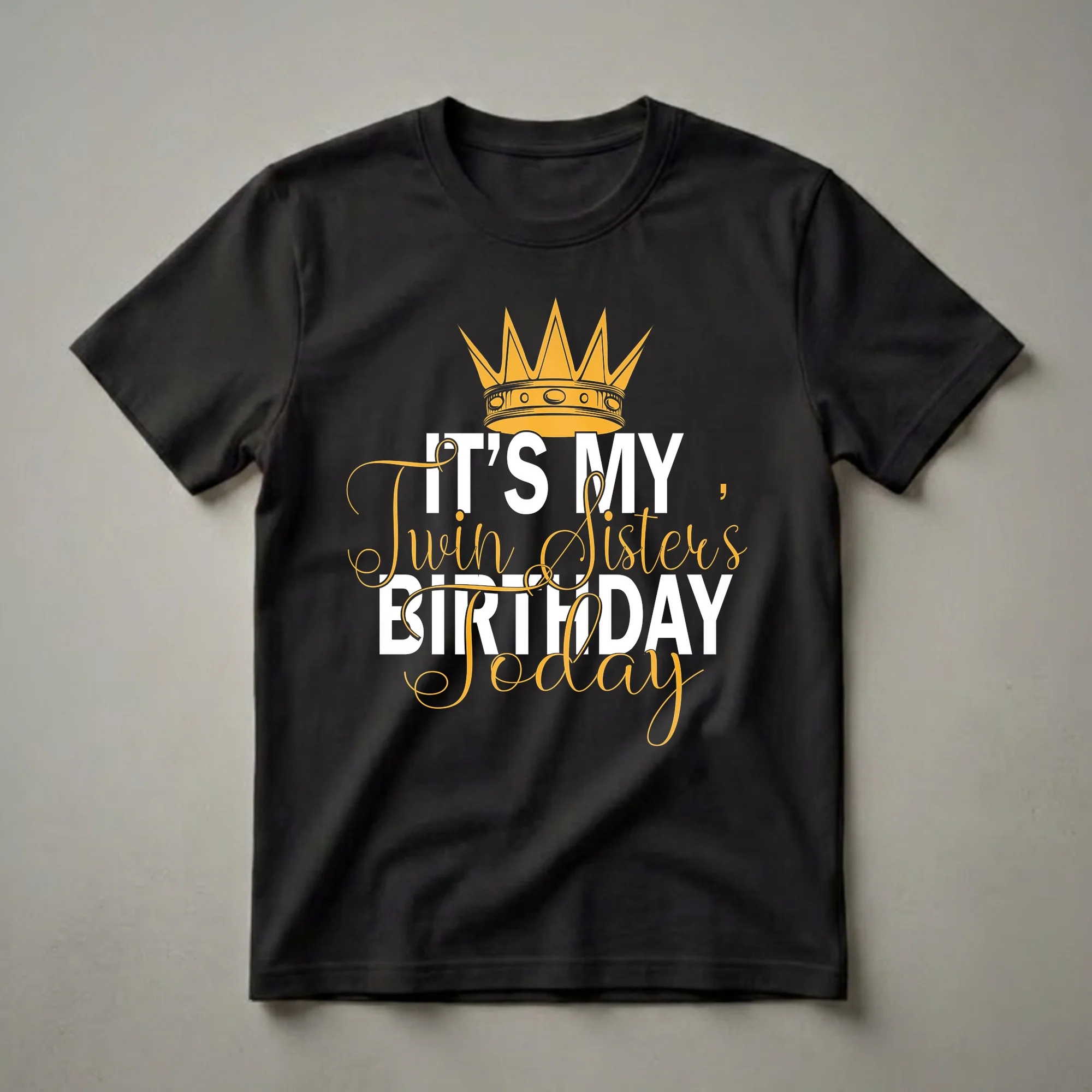 - This graphic tee proudly announces 'IT'S MY TWIN SISTER'S BIRTHDAY Today' alongside a regal golden crown accent.