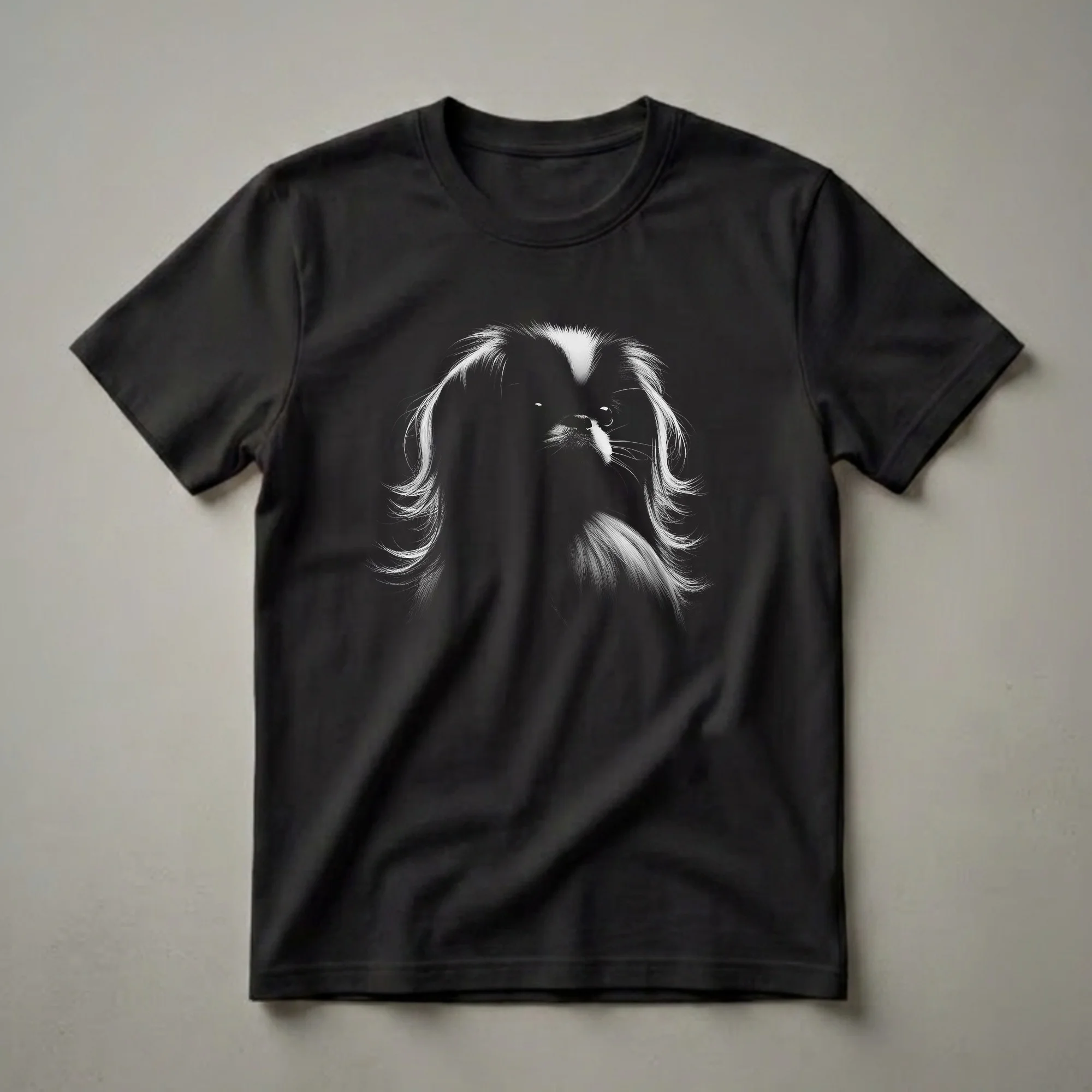 Japanese Chin owners know the breed's distinctive regal appearance and affectionate nature. This striking graphic tee captures the essence of the Japanese Chin with a dramatic, high-contrast art design. The image features the dog's face emerging from darkness, with bright white highlights illuminating its flowing fur, expressive eyes, and delicate whiskers. The Japanese Chin, originating from China and later developed in Japan, is known for its lion-like mane and charming personality, often described as a lap dog with a playful spirit. This t-shirt is a perfect way for any Japanese Chin mom or dad to express their devotion to their beloved companion. It makes a thoughtful gift for birthdays, holidays, or just because. Wear this unique shirt to dog park meetups, casual outings, or while relaxing at home with your furry friend. It’s a conversation starter for anyone who appreciates the unique beauty of this small, elegant breed. This eye-catching design celebrates the distinctive look of the Japanese Chin, making it a go-to tee in any dog lover's wardrobe.