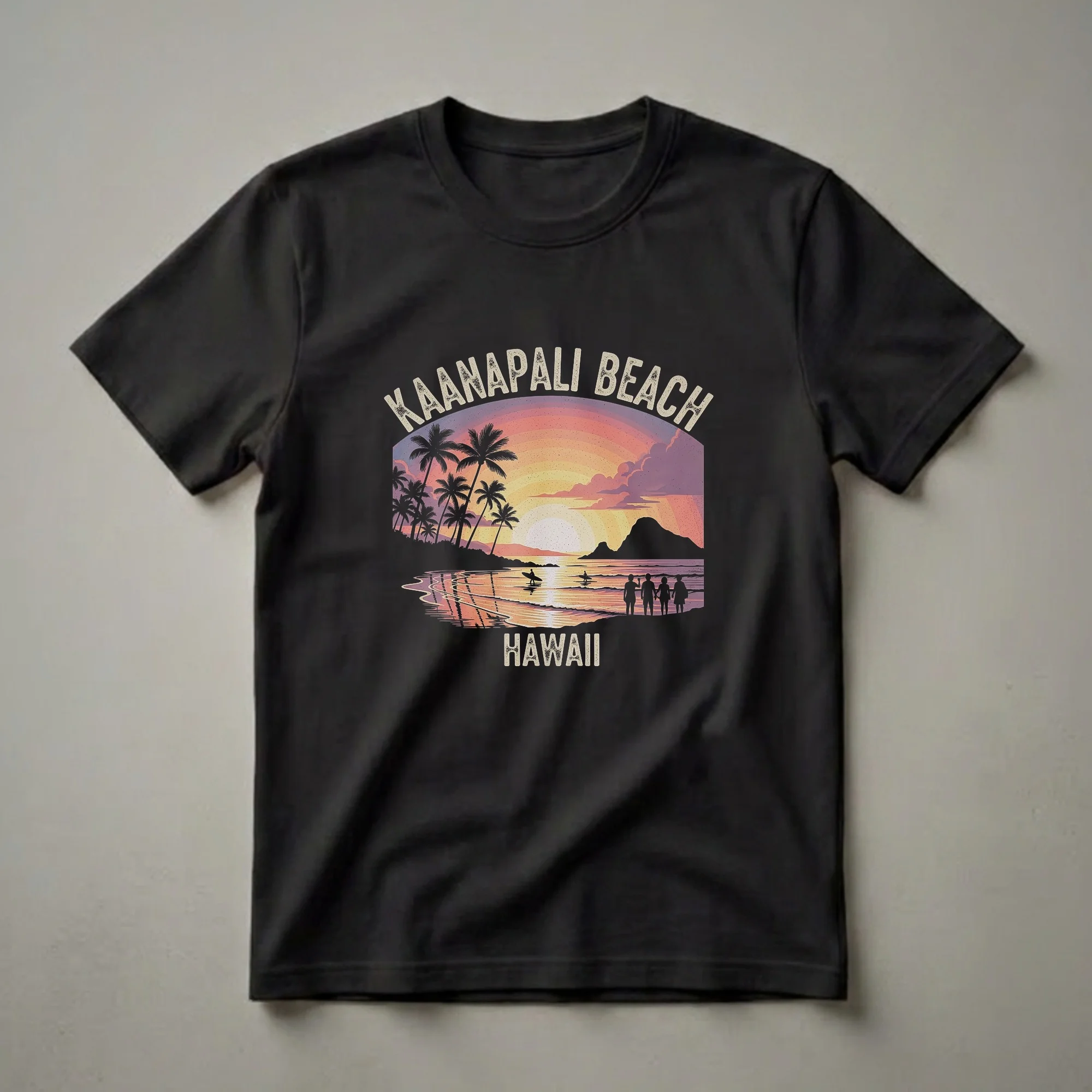 Kaanapali Beach, located on the island of Maui, Hawaii, is renowned for its stunning sunsets and surf-friendly waters. This graphic tee captures that iconic scene with a retro drawing art style. The design showcases a vibrant, multi-hued sunset behind silhouetted palm trees and distant mountains, reflecting on the ocean's surface. Two surfers are depicted in the water, one walking towards the shore with a board, and another further out. On the beach, a group of four people stand together, silhouetted against the colorful sky, evoking a sense of shared experience and relaxation. The words "KAANAPALI BEACH" arc across the top, with "HAWAII" centered below the scene. This t-shirt is a thoughtful gift for anyone who loves Hawaii, dreams of visiting Maui, or cherishes memories of this beautiful destination. It's a perfect way for beachgoers and surf enthusiasts to wear their appreciation for island life. This shirt works well for casual outings, beach days, or as a souvenir from a memorable trip to the Aloha State. Wear it to remember your favorite Hawaiian vacation or to inspire your next adventure.