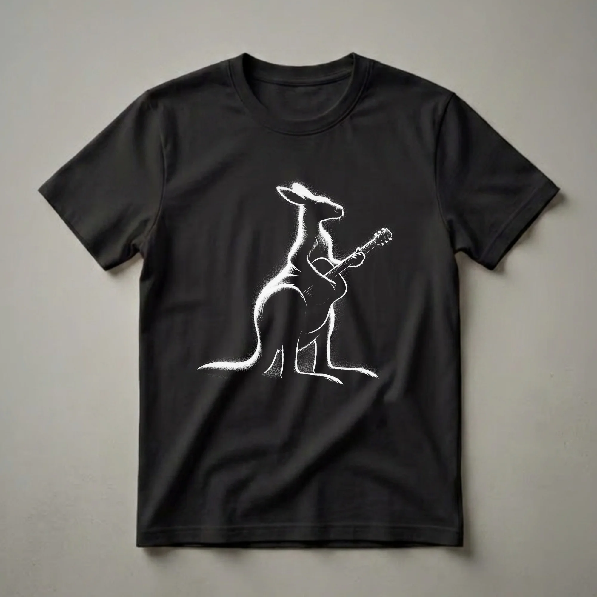 Musicians and guitar enthusiasts will appreciate this striking graphic tee featuring a kangaroo in silhouette, skillfully playing an acoustic guitar. Kangaroos, native to Australia, are known for their powerful hind legs and ability to hop, but this marsupial is showcasing a different kind of talent. The stark contrast of the white silhouette against the black background creates a bold, artistic statement, making this shirt a standout piece for any wardrobe. This t-shirt is a thoughtful gift for the guitarist in your life, whether they play acoustic, electric, or bass guitar. It’s a conversation starter at jam sessions, music festivals, or casual get-togethers. The design captures the joy and passion of playing music, embodying the spirit of a true artist. This apparel is a staple for anyone who finds their rhythm and expresses themselves through the strings of a guitar. It’s a unique way to celebrate your musical journey and your appreciation for the instrument.