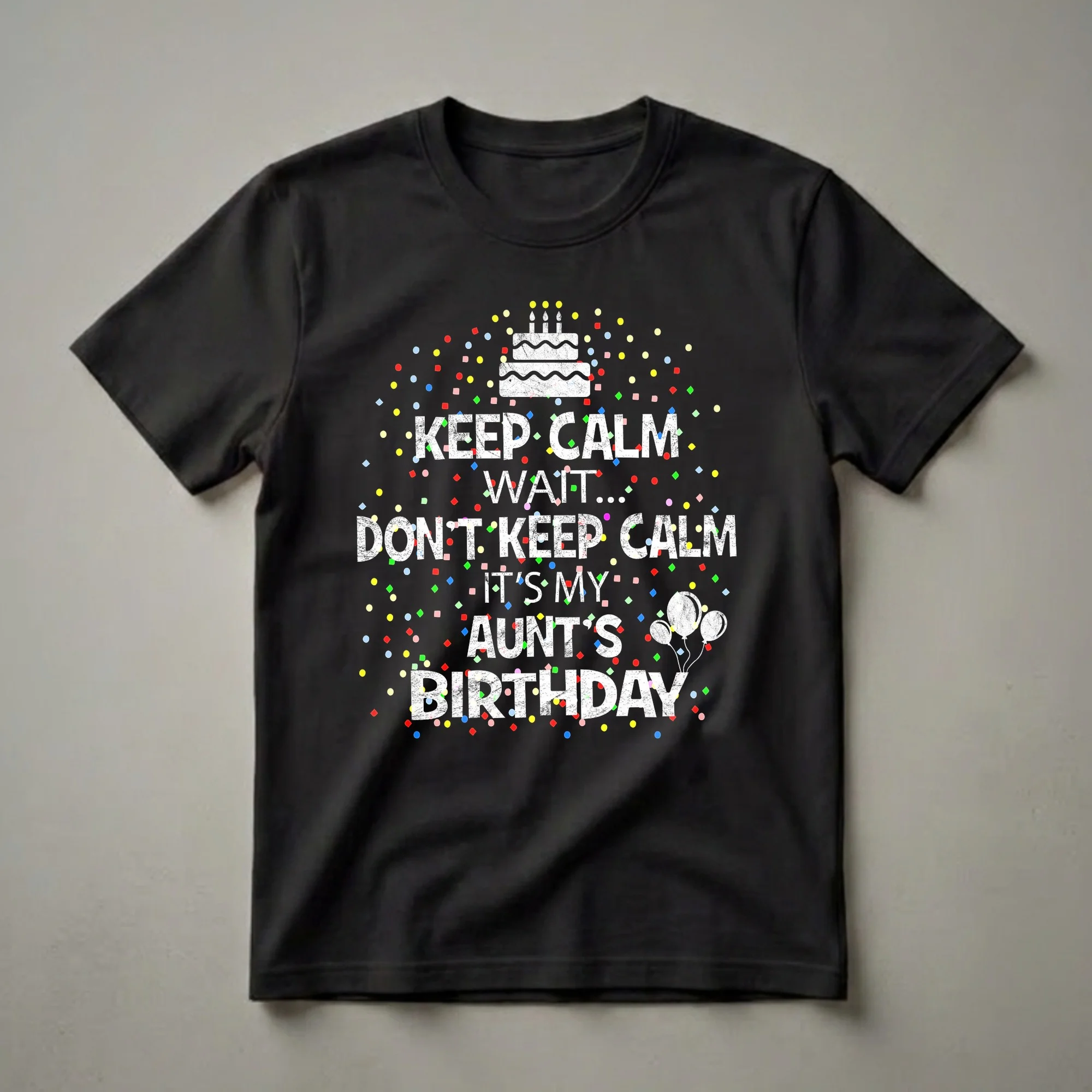 Aunt's birthday celebrations call for a bit of fun, and this graphic tee delivers. The design features bold, distressed white lettering that reads 'KEEP CALM WAIT... DON'T KEEP CALM IT'S MY AUNT'S BIRTHDAY.' This playful twist on a classic phrase is sure to bring a smile to her face. Scattered around the text are colorful confetti shapes in red, blue, yellow, green, and pink, along with a cluster of three white balloons, adding a festive party atmosphere. A white distressed graphic of a two-tiered birthday cake with three candles sits at the top, reinforcing the celebratory theme. This shirt is a thoughtful gift for any niece or nephew looking to celebrate their aunt. It's a great way to show appreciation and make her feel special on her birthday. Imagine her wearing this t-shirt to a family gathering, a birthday brunch, or a casual get-together. It's a comfortable and eye-catching piece of apparel that announces the special occasion with humor and style. This tee is a staple for any aunt who enjoys being the center of attention on her birthday.