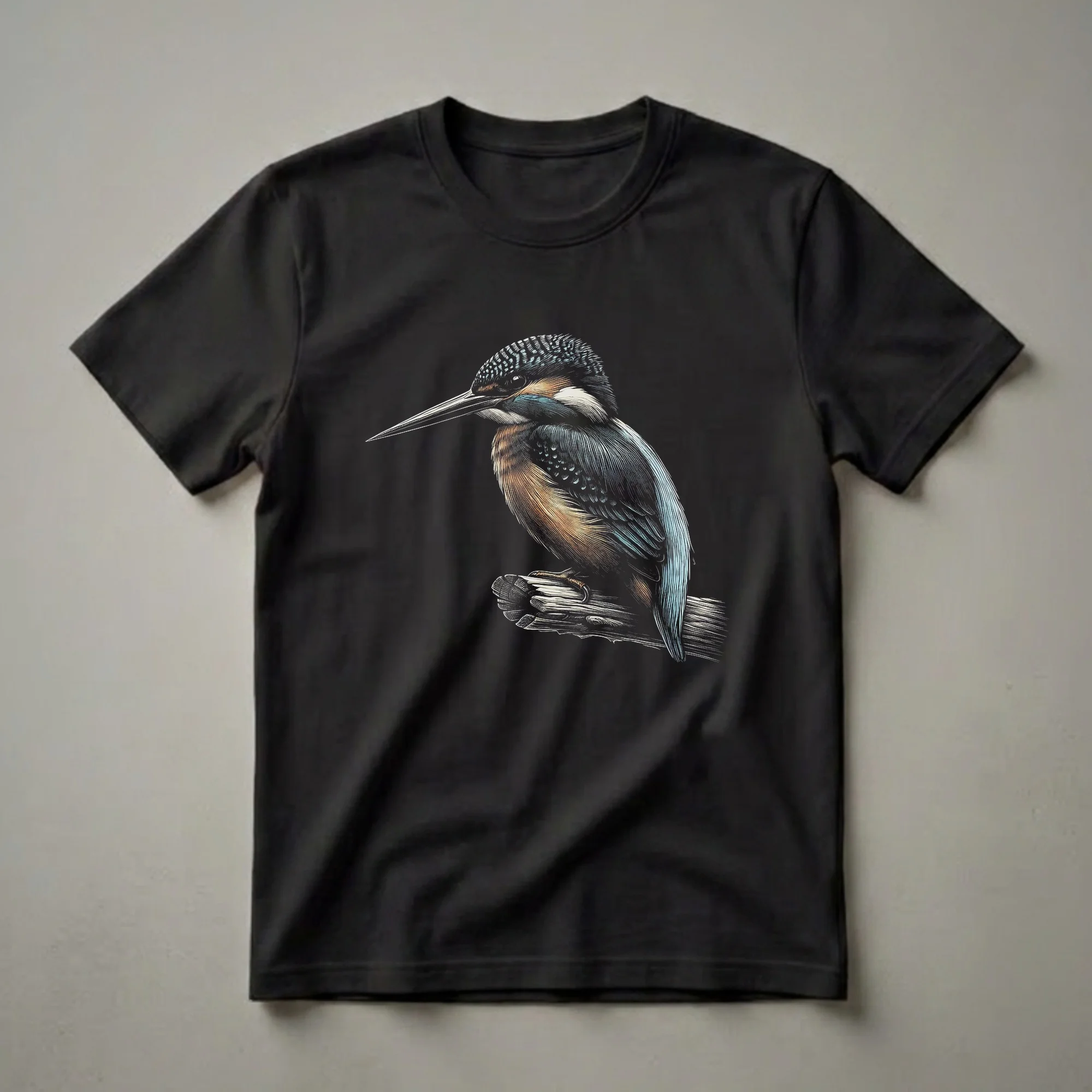Birdwatchers and nature lovers will appreciate the intricate detail of this kingfisher graphic art t-shirt. The design features a striking kingfisher perched on a weathered branch, rendered in a scratchboard style that highlights the bird's vibrant plumage. Notice the sharp, pointed beak, the iridescent blues and oranges of its feathers, and the delicate grip of its talons on the wood. Kingfishers are known for their rapid flight and expert diving skills, often found near rivers, lakes, and coastlines where they hunt for fish. This tee captures the essence of these fascinating birds, making it a go-to tee for anyone who admires their beauty and hunting prowess. It's a thoughtful gift for the birder in your life who enjoys observing wildlife in its natural habitat. Wear this shirt on your next nature walk or to your favorite birding spot to spark conversations about these incredible creatures. This unique t-shirt is a staple for any ornithology enthusiast's wardrobe, celebrating the natural world with artistic flair.