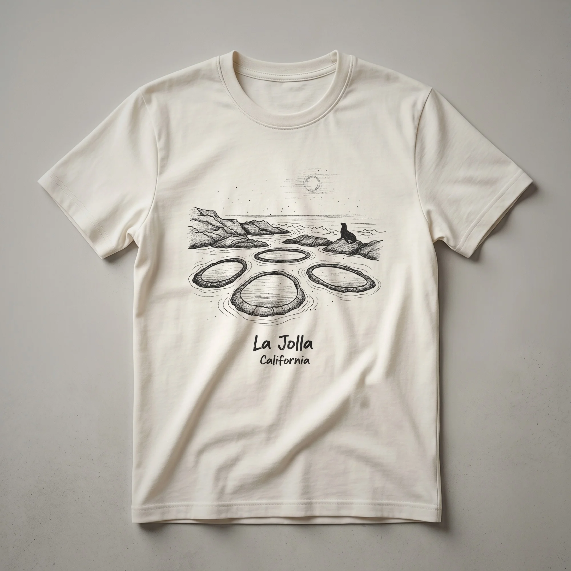 La Jolla, California, a picturesque coastal community known for its stunning coves and abundant marine life, is beautifully captured in this artistic sketch design. The graphic showcases the iconic La Jolla coastline, with rolling hills in the background under a celestial moon. In the foreground, the distinctive sea caves, or 'La Jolla Caves,' are depicted as circular formations in the water, hinting at the geological wonders that define this area. Perched on a rocky outcrop, a solitary sea lion surveys the ocean, a common and beloved sight for visitors and locals alike. This t-shirt is a thoughtful gift for anyone who cherishes the natural beauty of Southern California, from residents to travelers who have fond memories of exploring the tide pools and beaches. It's a staple in the collection for those who appreciate unique travel-inspired apparel. Wear this tee to your next beach outing, a casual day exploring San Diego, or simply when you want to carry a piece of the California coast with you. This shirt celebrates the unique charm and wildlife of La Jolla, making it a go-to tee for coastal enthusiasts.