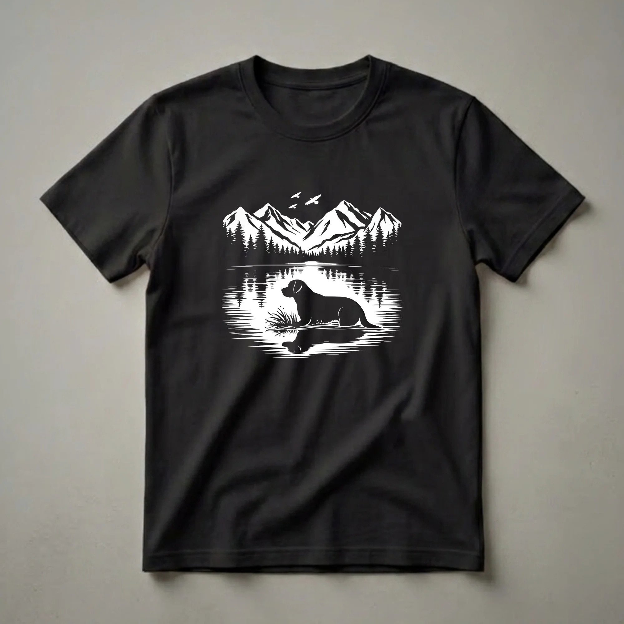 Labrador Retriever owners know the breed's energetic spirit and love for the outdoors. This graphic tee captures that essence with a striking black silhouette of a Lab wading in calm water. Behind the dog, a serene nature scene unfolds, featuring a dense line of pine trees leading to majestic, snow-capped mountains under a sky with three birds in flight. The reflection of the dog, trees, and mountains shimmers on the water's surface, creating a captivating visual. Labrador Retrievers, known for their friendly disposition and retrieving abilities, are often found enjoying activities like swimming and exploring natural landscapes. This shirt is a thoughtful gift for any Labrador mom or dad who cherishes their dog's adventurous spirit and connection to nature. It's a go-to tee for casual outings, hikes, or simply relaxing at home, celebrating the bond between owner and canine companion. Wear this t-shirt to express your passion for Labs and the great outdoors.
