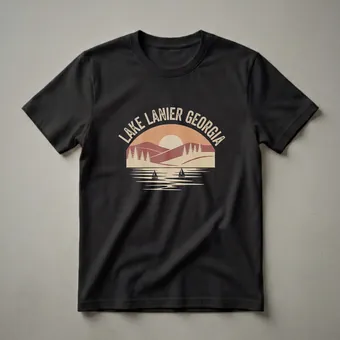 Lake Lanier, a reservoir in the northern Georgia mountains, is a popular destination for boating, swimming, and fishing. This retro-inspired graphic tee captures the serene beauty of the lake with a vintage sunset scene. The design features rolling hills, a silhouette of pine trees, and two sailboats gliding across the water, all framed by the text 'Lake Lanier Georgia' in a distressed, retro font. The color palette evokes a warm, nostalgic feel, reminiscent of classic travel posters. This shirt is a thoughtful gift for anyone who cherishes memories of summer days spent on Lake Lanier, whether they are a local resident or a frequent visitor. It's a great way for Georgians to showcase their state pride and love for this iconic recreational spot. Wear this t-shirt to your next lake outing, a casual brunch, or simply as a reminder of your favorite Georgia getaway. It's a staple in the collection for any fan of vintage travel art and outdoor adventures.