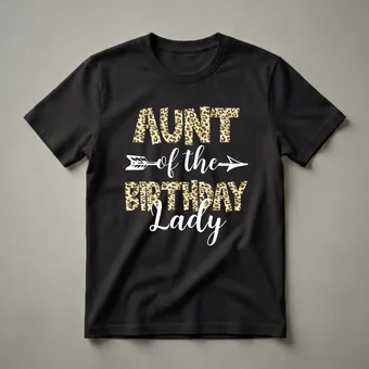 Aunts who want to show their pride for the birthday girl will reach for this eye-catching graphic tee. The design features bold, block letters spelling out "AUNT" filled with a classic leopard print pattern. Below this, in a stylish white script font, reads "of the", accented by a white arrow graphic pointing to the right. The bottom portion of the design, "BIRTHDAY Lady", also uses the same leopard print fill for its block letters, creating a cohesive and striking look. This shirt is a thoughtful gift for any aunt celebrating a special birthday girl in her life, whether it's for a niece, goddaughter, or granddaughter. It’s a fun way for her to join in the birthday festivities, making her feel like part of the party squad. This tee works well for birthday brunches, family gatherings, or any celebration honoring the birthday lady. It’s a staple in the collection for any aunt who loves to celebrate.