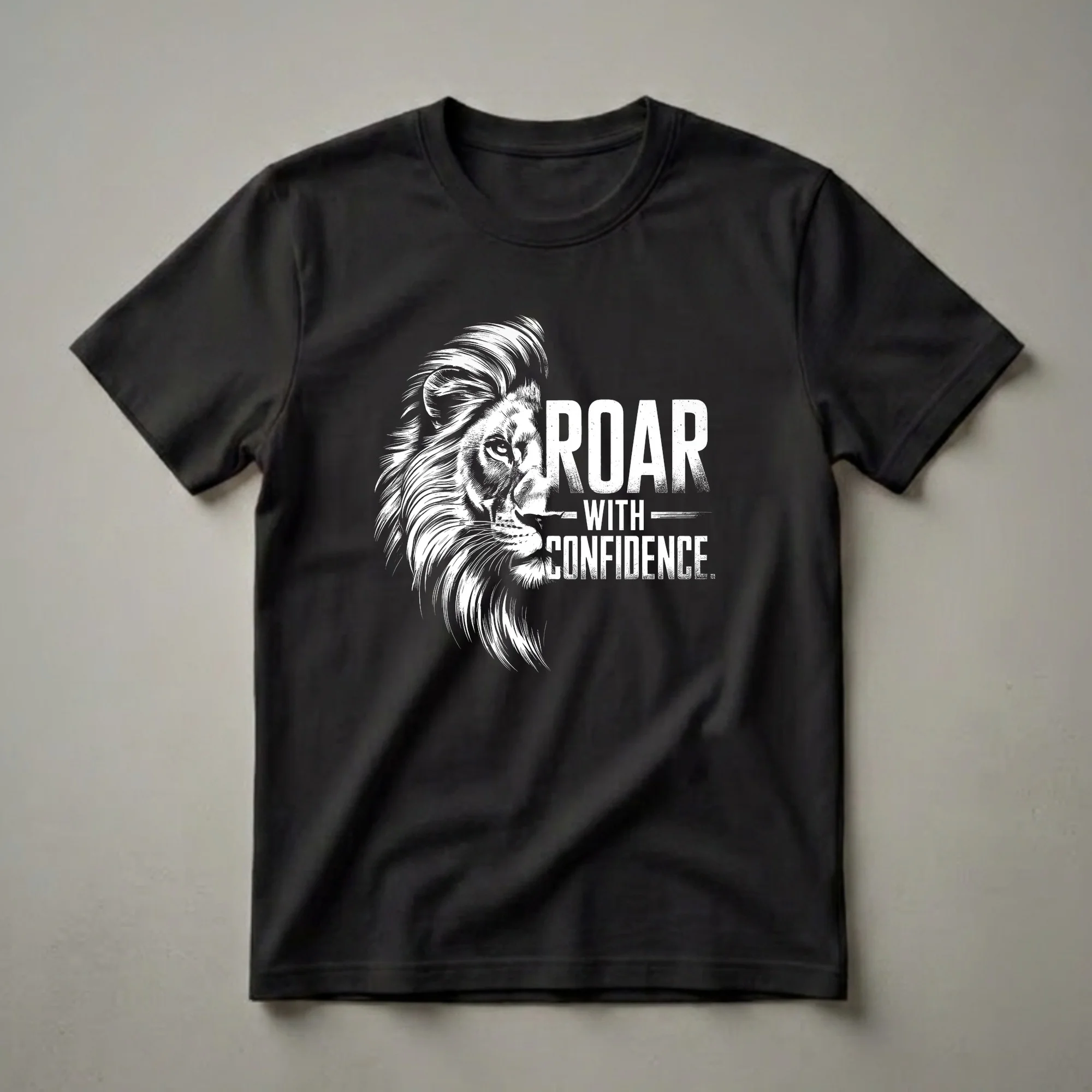 Lions, often referred to as the 'king of the jungle,' are apex predators known for their majestic manes and powerful roars. This striking graphic tee captures the essence of this magnificent creature, featuring a detailed illustration of a lion's head alongside the bold declaration 'ROAR WITH CONFIDENCE.' The design is rendered in a high-contrast white on a black background, giving it a dramatic and eye-catching appeal. This t-shirt is a fantastic choice for men and women who admire the strength and courage symbolized by the lion. It serves as a daily reminder to face challenges head-on and to embrace one's own power. This shirt works well for anyone who appreciates wildlife art or seeks motivational apparel. It makes a thoughtful gift for the lion lover in your life, or for someone embarking on a new journey who needs a boost of self-assurance. Wear this tee to casual outings, hikes in nature, or whenever you want to make a bold statement about your inner fortitude. The lion's habitat spans across parts of Africa and India, and its presence signifies royalty and bravery in many cultures.