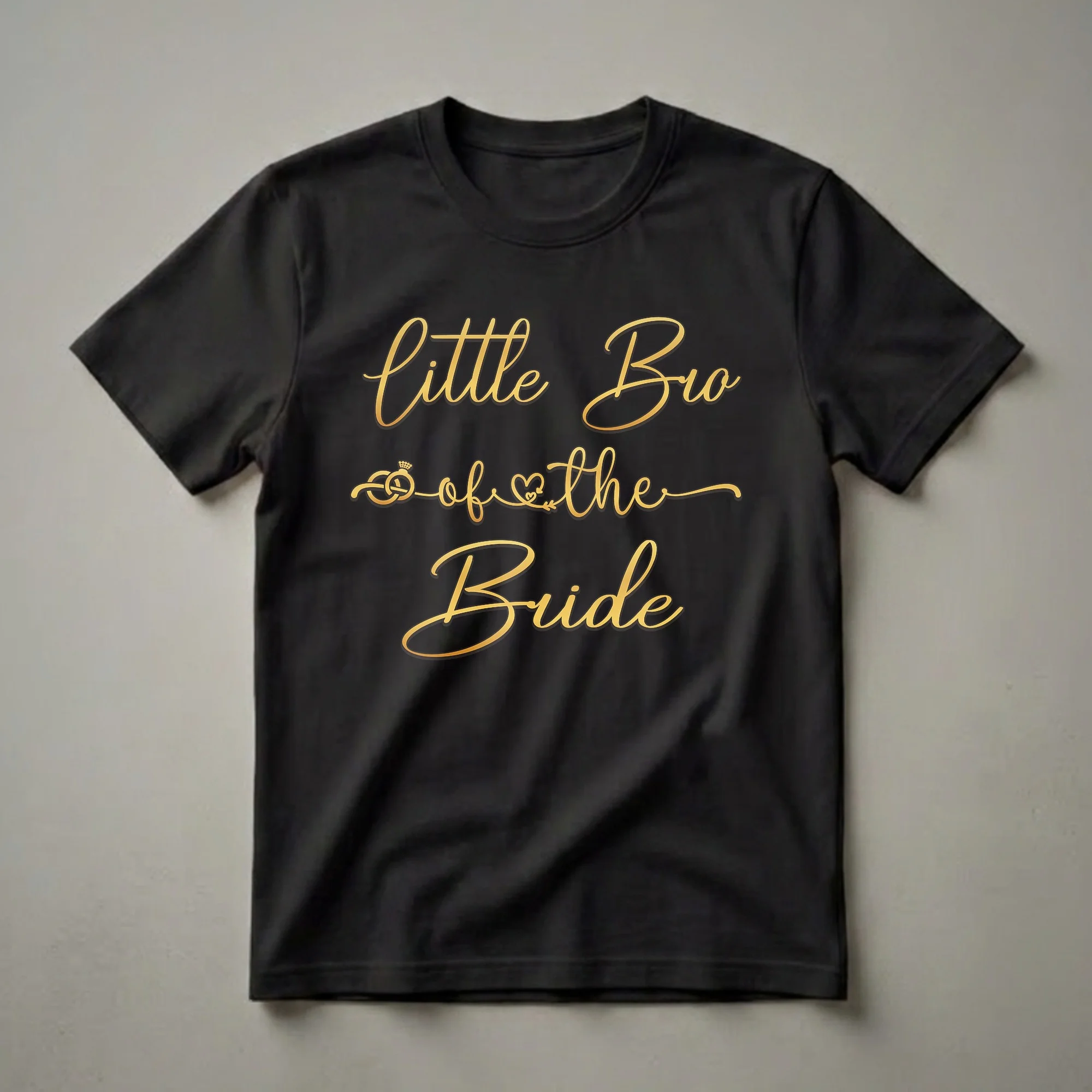 - Elegant gold script on this tee highlights 'Little Bro of the Bride' with symbolic graphics.
