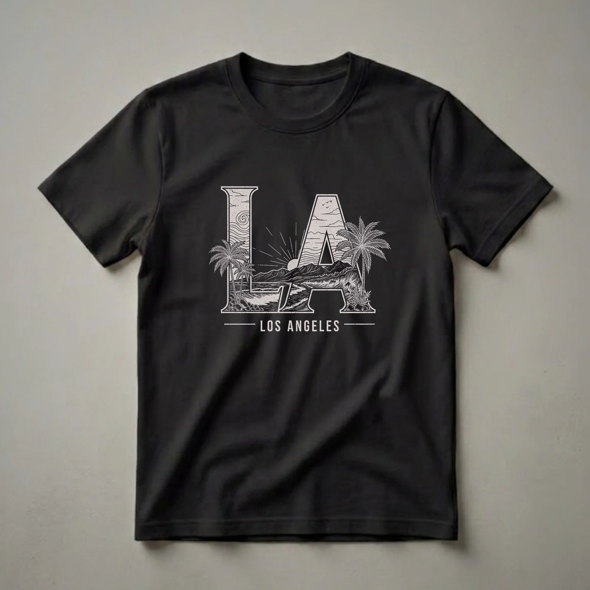 Los Angeles stretches along 75 miles of Southern California coastline, where the Santa Monica Mountains meet the Pacific and palm trees line every boulevard from Silver Lake to Santa Monica. This graphic tee captures that geography in striking fashion: the bold serif letters 'LA' are filled edge-to-edge with an intricate engraved illustration of rolling ocean waves, towering palm trees, mountain ridgelines, and a radiant sunburst breaking over the water. Small birds soar in the sky above the lettering. Below the oversized letterform, 'LOS ANGELES' is printed in clean capital letters framed by two horizontal dash lines, giving the design a bold typographic finish. Anyone who grew up in the San Fernando Valley, spent summers in Venice Beach, or moved to LA chasing sun and opportunity will feel a connection to this shirt. It also resonates with visitors who fell in love with the city and want a wearable keepsake that goes beyond a standard tourist tee. Wear this shirt to a rooftop gathering, a beach day in Malibu, or while watching the sunset from Griffith Park. It makes a thoughtful gift for the friend heading to UCLA, the California expat who misses the Pacific Coast Highway, or any SoCal enthusiast who wants to carry a piece of Los Angeles with them.